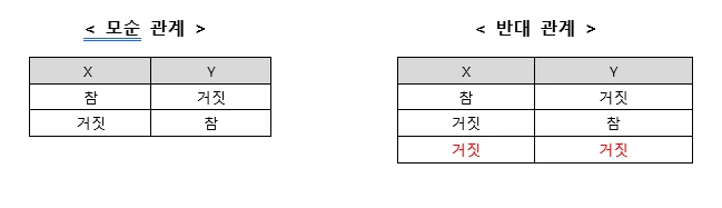 논리학에서 모순 관계는 두 명제가 동시에 참이거나 동시에 거짓일 수 없는 관계고, 반대 관계는 두 명제가 동시에 참일 수는 없으나 동시에 거짓일 수는 있는 관계다. 예를 들어 삶과 죽음, 있음과 없음은 모순 관계고, 흑과 백은 반대 관계다. 즉 반대 관계에는 중간지대가 존재한다.
