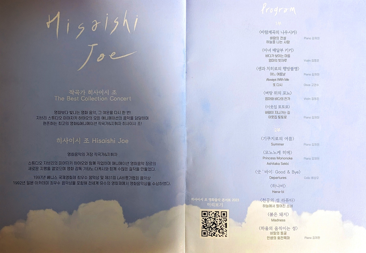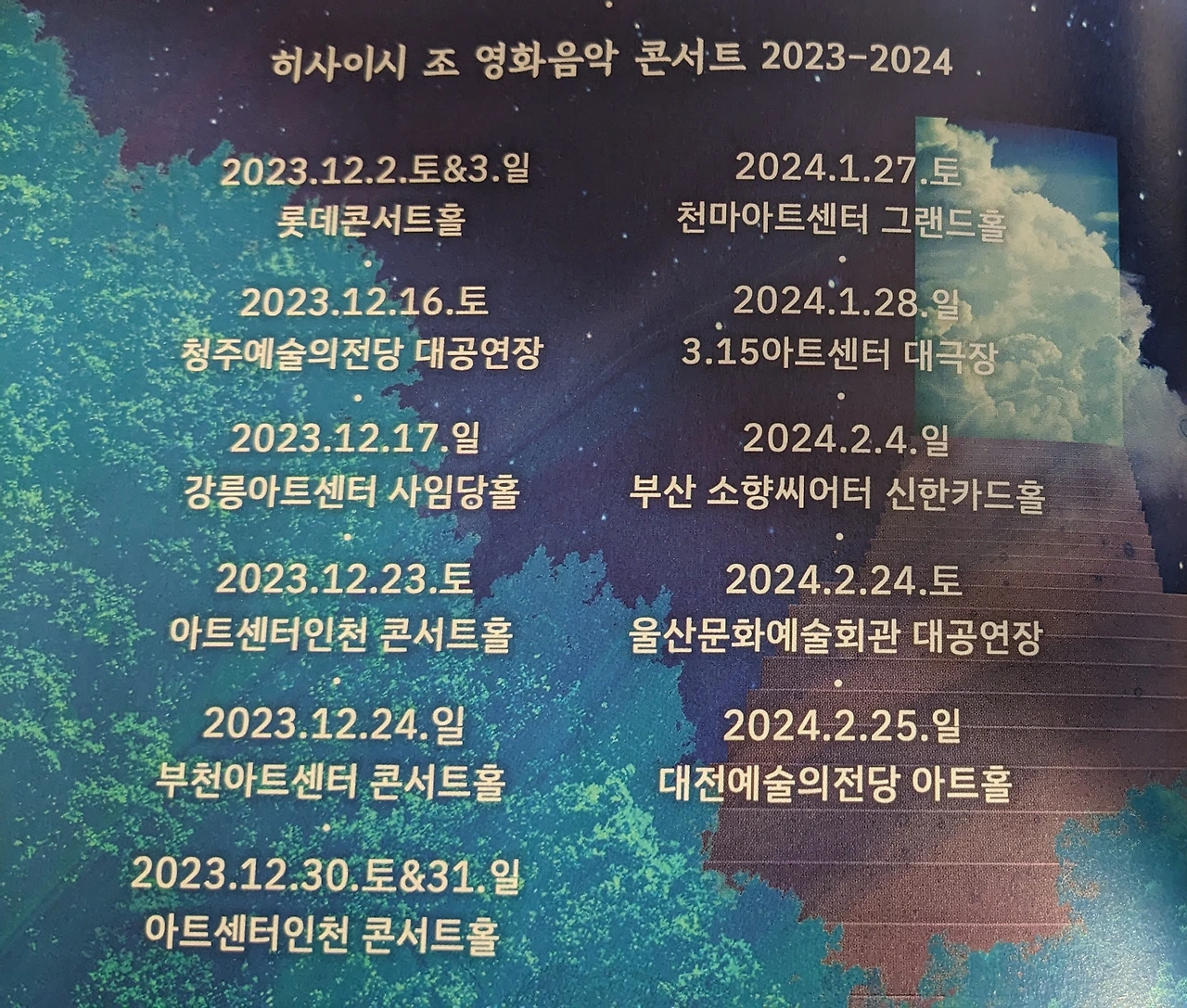그럼에도 그때가 아니면 안 되는 일은 챙겨둔다. 그중 하나가 연말 연주회 감상이다. 2023.11.25. 세종 예술의 전당 히사이시 조 영화음악 콘서트를 일찌감치 예매해뒀다. 왜 연말이냐 하면 쌀쌀한 바깥바람을 서두른 걸음으로 지나쳐 들어온 뒤, 객석에서 맞이하는 정돈된 분위기와 살짝 들뜬 공기가 좋기 때문이다. 어느새 휩쓸리 듯 다다른 연말즈음에 잠시 고르는 숨이 좋아서다.