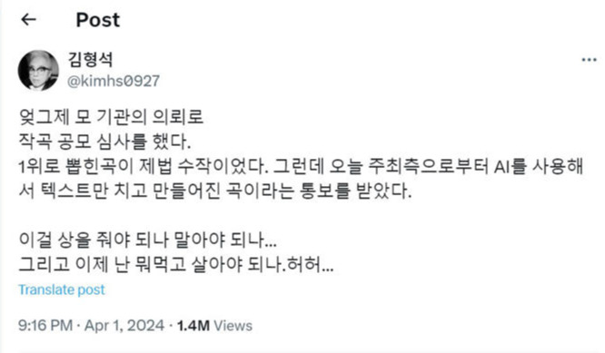 2022년 미국 ‘콜로라도 주립 박람회 미술대회’에서 디지털아트 부문 1등은 AI의 Theatre D'opera Spatial가 차지했다. 텍스트 한 줄만으로 AI가 순식간에 그렸다고 한다. 음악계 사정도 다르지 않다.