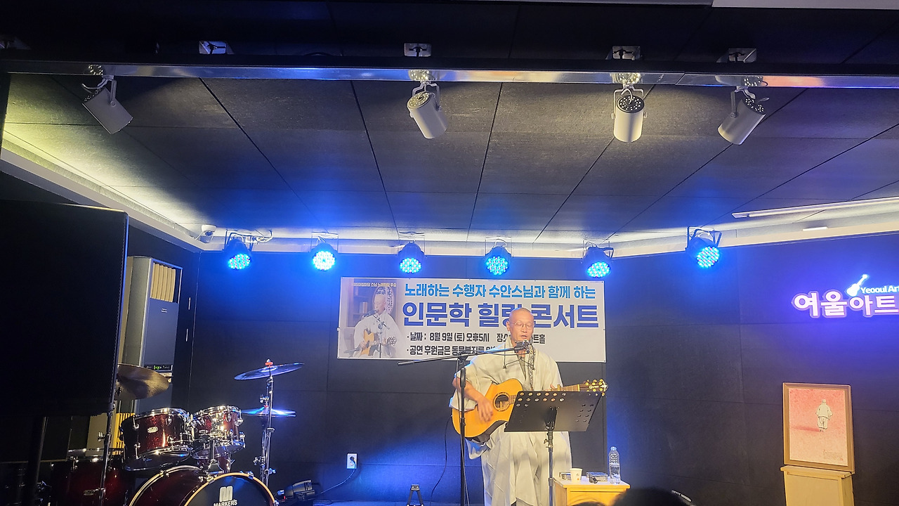 여울 아트홀은 많아야 40명 정도가 들어갈 수 있는 조그만 공연장이다. 앞에서 두 번째 줄에 앉아 공연을 관람했다. 지척에서 공연을 관람하는 것은 오랜만이다. 훌륭한 음향시설에 하모니카와 기타가 어우러진 스님의 공연은 때로는 ‘심쿵’ 때로는 ‘떼창의 흥분’이었다. 대형 공연장에서는 느낄 수 없는 특별한 감동이었다.