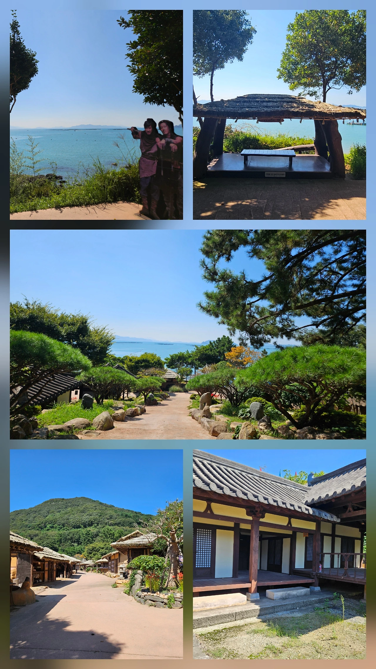 저는 곧바로 청해포구 드라마 촬영소를 찾았습니다. 누가 이곳을 섭외했을까 싶을 정도로 기막힌 경치 위에 세트장이 설치되어 있었는데, 그 모습이 정말 아름다웠습니다. 남해 바다 특유의 잔잔한 물결과 고운 바다색이 인상적이었습니다. 중부지방에서는 보기 힘든 나무와 식물들도 눈에 띄었는데, 마치 제주도의 비경을 미리 보여주는 듯한 광경이었습니다. 심지어 드라마 '추노' 속 추노꾼 들이 저를 반기기도 했습니다. 여러 드라마에서 봤을 법한 예쁜 세트들이 시선을 사로잡았습니다.
