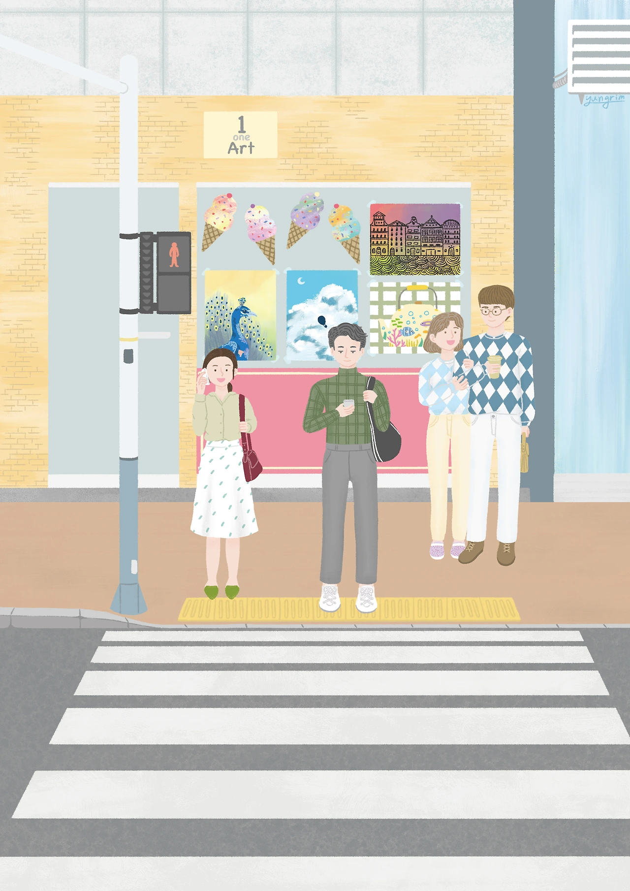 횡단보도에 서면 항상 건너편에서 익숙하게 볼 수 있는 정겨운 동네 느낌의 일러스트를 그려봤습니다:)