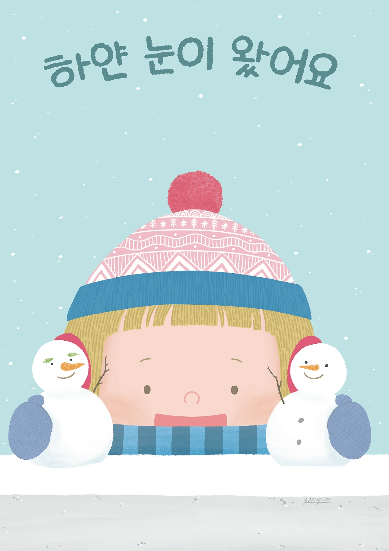 새하얀 눈이 가득히 내린 날, 귀여운 아이가 눈사람도 만들고 신나게 노는 모습을 상상하며 그려보았어요ㅎㅎ