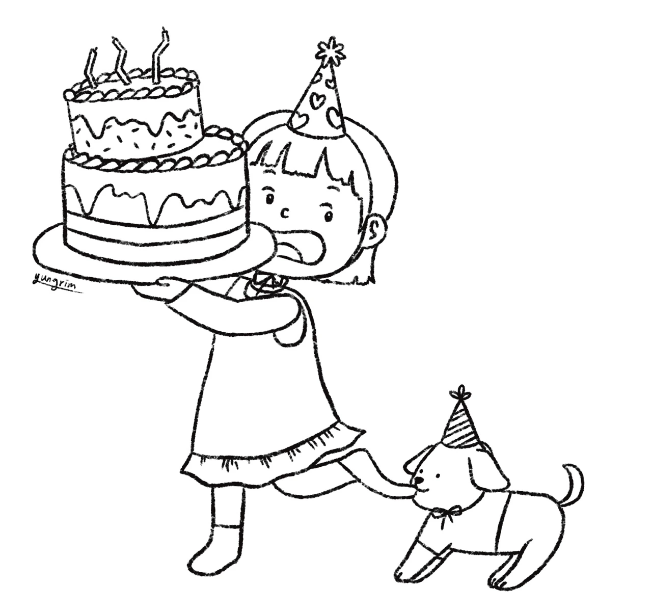 [무료 색칠공부 도안] 소녀와 강아지의 생일파티
