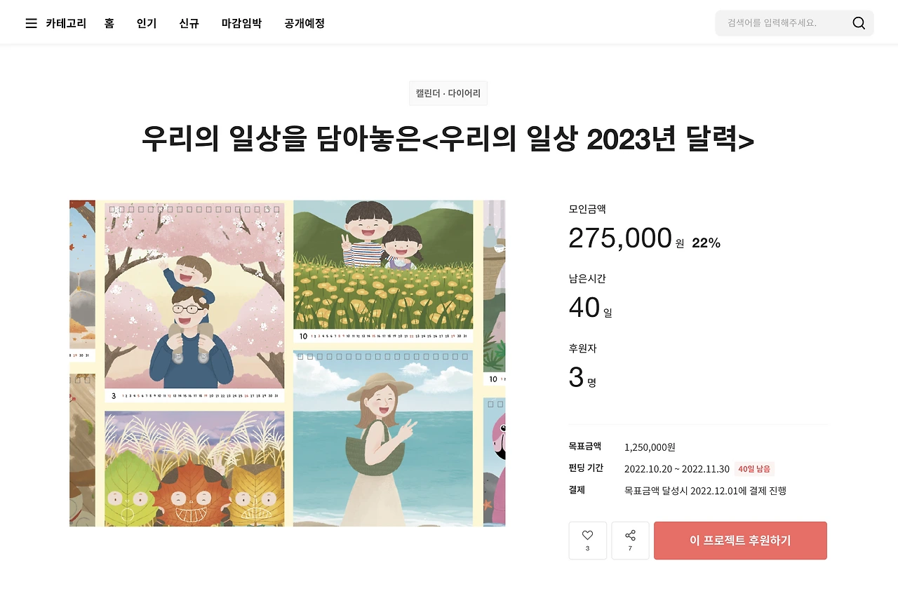 안녕하세요. 우리의 일상을 담은 따뜻한 이야기를 그림으로 그려 2023년 달력 텀블벅을 오픈하게 되었어요:)