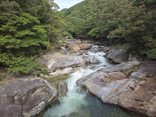 수평으로 평안을 안고 흐르는 계곡 물 속은 대원사도 하늘도 구름도 바람도 소리도 안고 있다. 하지만 계곡 속으로 내려가면 허공이다. 색즉시공(色卽是空)이 이것이다. 계곡의 넓이와 깊이가 계곡물이 참선한 수련의 경험을 보여주고 있다. 군데군데 거친 바위들이 잠시 깨달음을 얻은 흔적으로 여기저기 널려 있다.