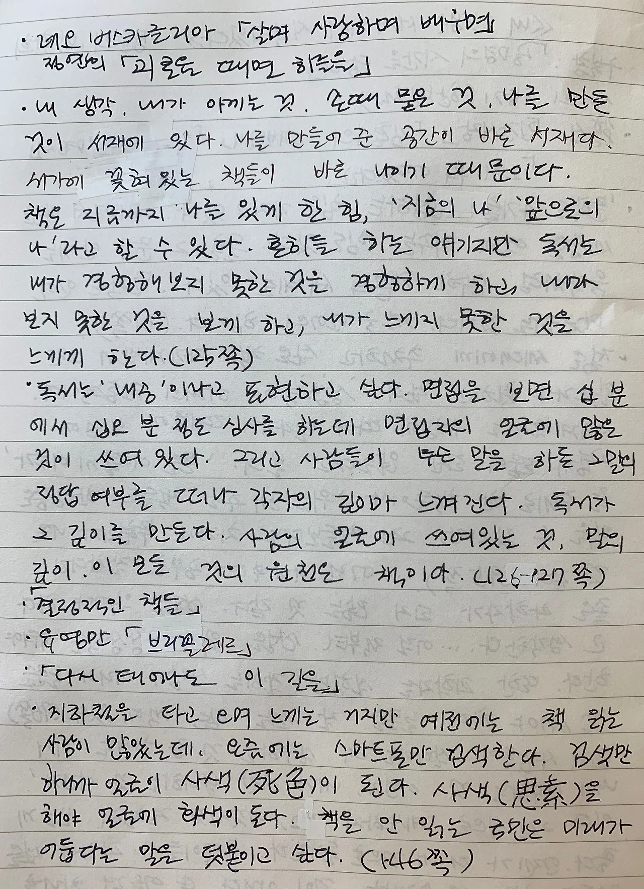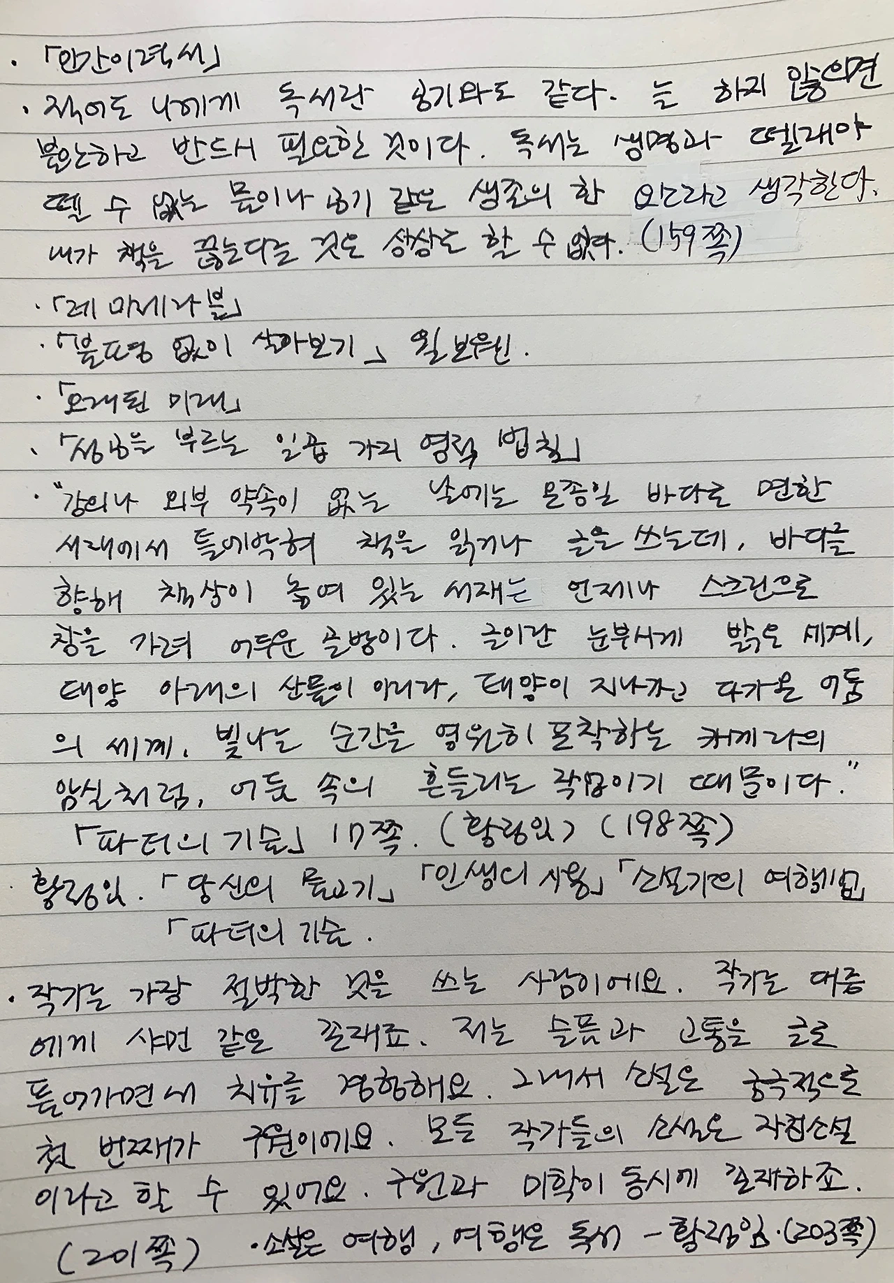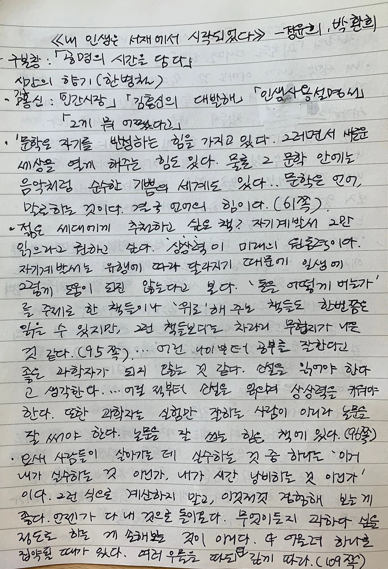 어릴 때부터 책 읽기를 즐겼던 이도 있지만 뒤늦게 책을 좋아하게 된 경우도 있다. 결론은 현재는 책 없이는 못 사는 공기와 같은 존재로 여긴다는 것이다. 상상력을 위해 자기 계발서보다 소설을 읽으라는 조언과 독서는 내공이고 말하는 동안 그 사람의 깊이가 드러난다는 말이 인상적이다. 무언가에 몰두하는 시간을 낭비라고 생각하지 말고 이것저것 경험하되 깊이 파라는 안정효 님의 말도 인상적이다.