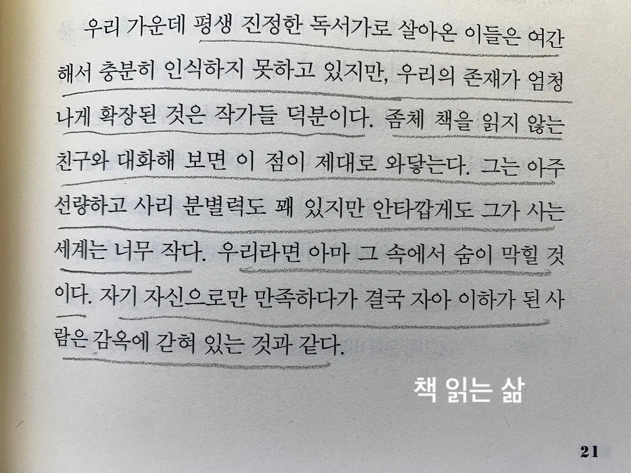 저자는 독서를 타인의 눈으로 새로운 세계를 보는 것이라고 하였다. 독서를 하지 않는 사람도 도덕적이고 견해를 가질 수 있지만 대화를 해 보면 세계가 너무 좁다는 것을 알게 된다고 말한다. 저자의 말에 따르면 더 넓은 세계를 갖기 위해 우리는 독서를 할 필요가 있다. 역사나 세상 공부도 교과서나 역사책도 좋지만 문학을 통해서 할 것을 권한다. 훨씬 넓고 깊게 접할 수 있을지도 모른다.