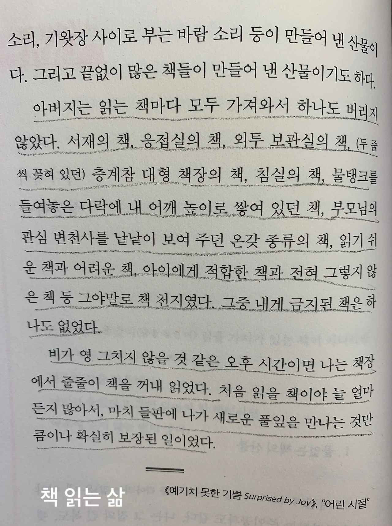 어린 시절 비 오는 날 오후 부모님이 여기저기에 쌓아둔 책들을 하나씩 읽었던 추억을 회상하는 저자는 아마도 어린 시절부터 책을 엄청나게 읽었을 것이다. 아이를 키우는 집에 책이 많으면 어떠게든 읽게 되는 것일까? 책이 많다고 꼭 독서가가 되는 것은 아니겠지만 상관관계가 조금은 있을 것 같다. 책 중에서도 해롭다고 생각하는 것은 다시 읽지 말라고 쓰기도 했다니 닥치는 대로 읽는 것도 좋지만 선별해 읽을 필요도 있다. 신서와 고서 중 고르라면 고서를 고르겠다고 한 저자는 고서 읽기를 권한다. 고전을 해설한 책보다는 직접 고전을 만나라고 하였다.