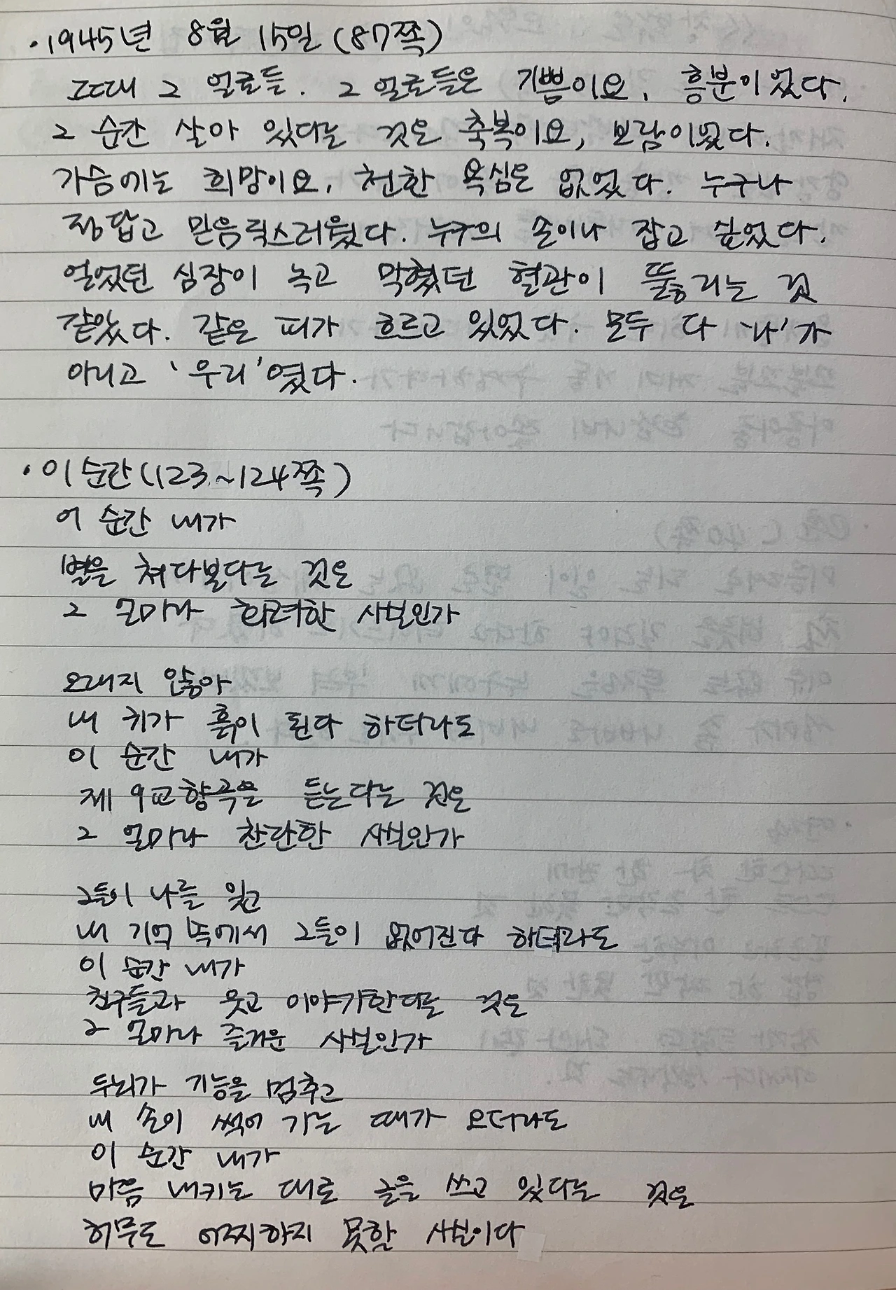 총 11 개의 큰 주제로 묶인 이 시집에는 다양한 시들이 실려 있다. 가족애, 자연, 인간관계에 대한 시도 있지만 해방의 기쁨이나 안중근 의사를 추억하는 시대를 반영한 시도 있다. 초등학생 때였던가 ‘아가의 오는 길’의 대목대목을 외던 생각이 난다. 교과서에 나왔었는지도 모르겠다. 다시 보니 반가워 공책에 옮겼다. 카페에서 아기를 보며 ’아가의 오는 길‘을 읽으니 느낌이 바로 와닿았다. 회갑 지난 제자들이 찾아왔다는 이야기에 마음이 찡했다. 지금은 그의 제자들 중에도 세상을 떠난 분들이 있을지 모르겠다. 세월의 무상함과 남은 글의 고귀함을 느꼈다. 우리는 언젠가 모두 흙으로 돌아가지만 지금 듣고 있는 음악과 지금 읽고 있는 글이 얼마나 소중한 것인지 ‘이 순간’이라는 시를 읽으며 다시 한번 깨달았다.