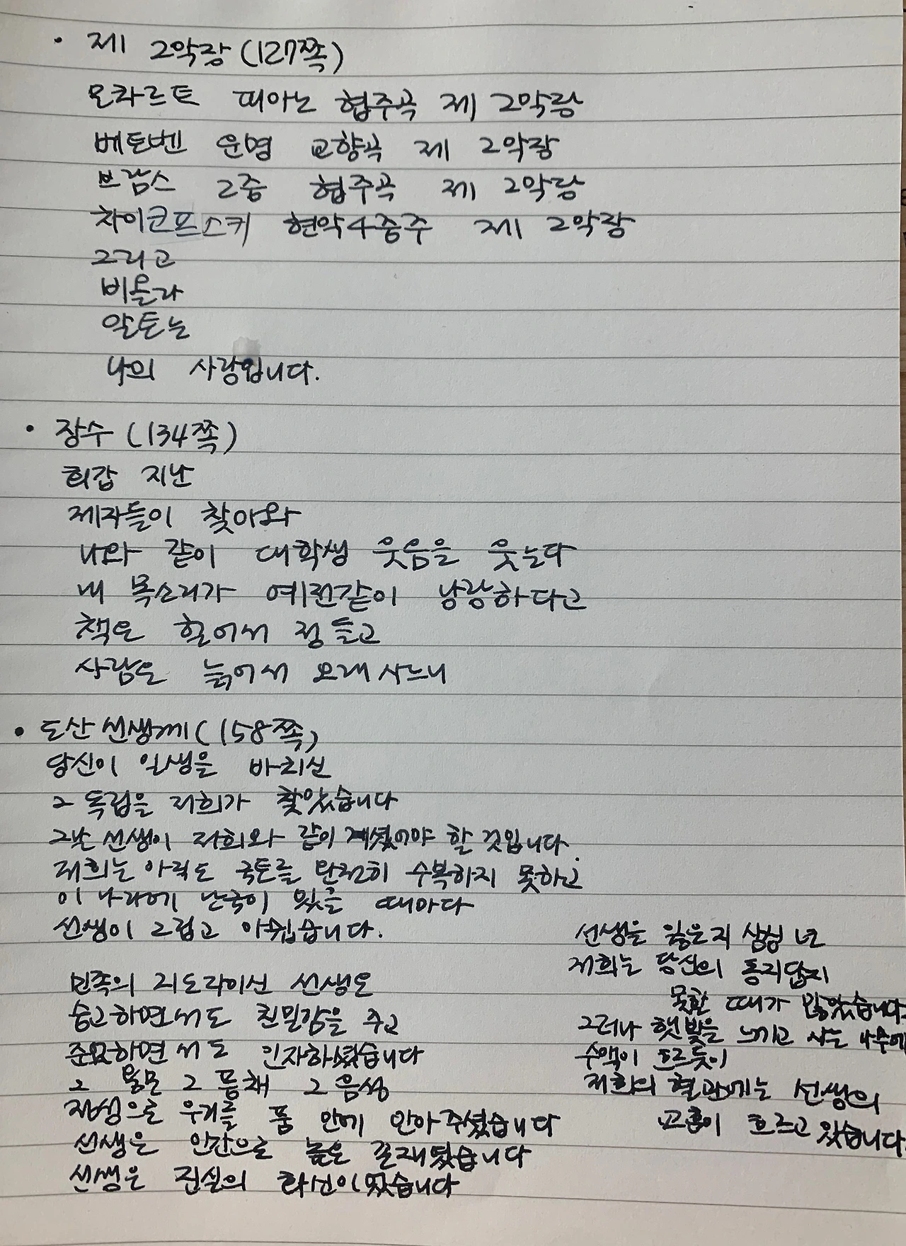 음악을 좋아해서인지 나에게 가장 인상적인 시는 제2악장이다. 그가 좋아한다는 곡들의 2악장들을 쏙쏙 골라 다시 들어보고 싶다. 나이가 들수록 고음의 화려함보다 저음이나 중음의 중후함을 사랑하게 되는 것일까? 그는 비올라의 알토 음을 좋아한다고 고백했다. 아직은 고음이 좋은 나도 더 나이가 들면 바뀌게 될지 궁금하다. 글을 마치려는 지금(처음 이 글을 쓰기 시작한 지 일주일 만에) 차이코프스키 현악 4중주 1번 제2악장 안단테 칸타빌레가 우아하고 숭고하게 울려 퍼지고 있다.