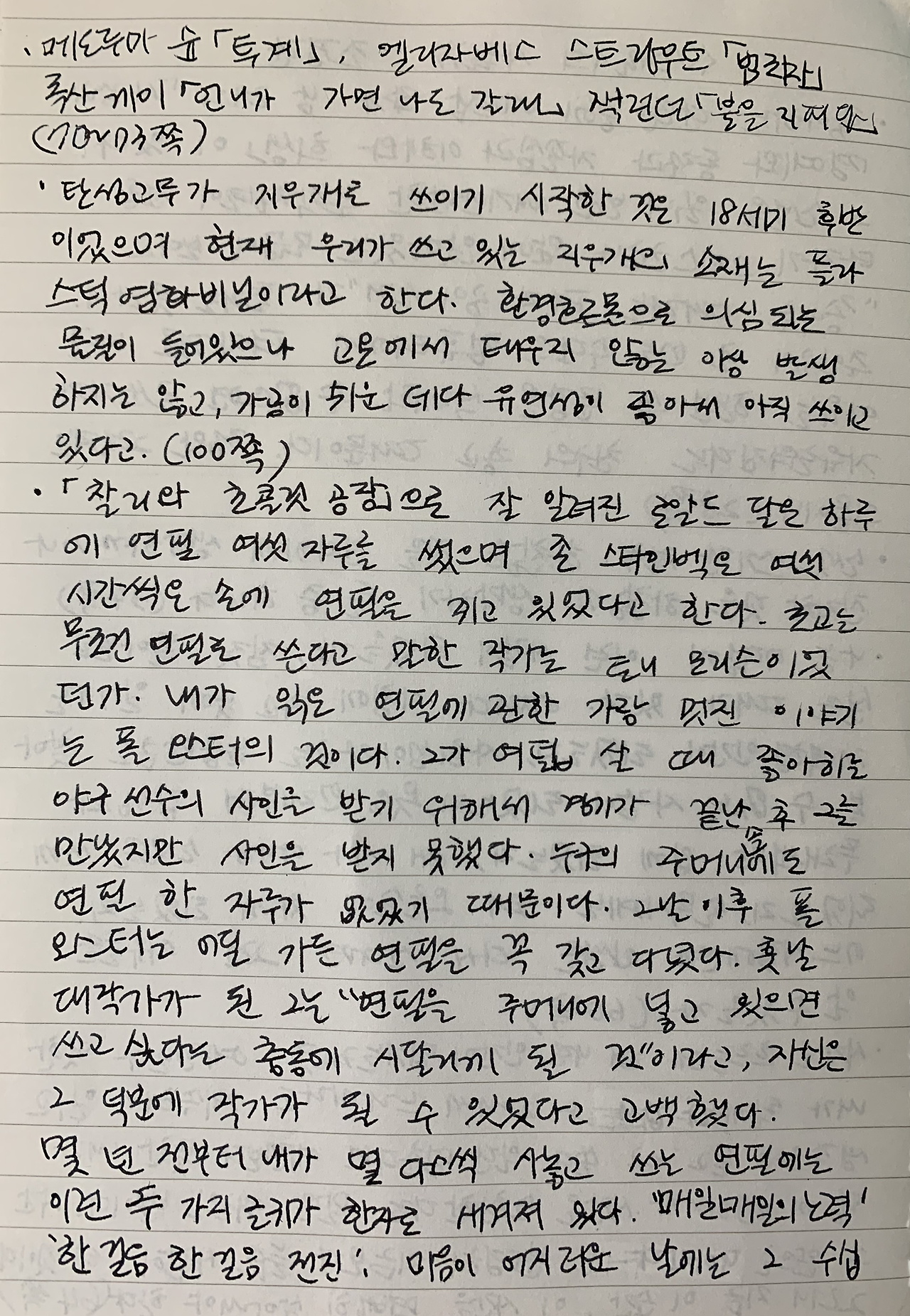 이 책을 작년엔가 빌려와 무척 바빴던지 들고 다니며 앞부분만 조금 읽다가 반납했었다. 표지가 익숙하여 빌려온 기억은 나는데 내 블로그에 리뷰가 없는 걸 보니 끝까지 읽지 못한 것이었다. 이번에 다시 빌려와 버스로 이동하는 틈틈이 들고 다니며 재미있게 읽었다. 물건 하나마다에 얽힌 사연과 읽었던 책들, 그리고 자신의 심상이 담겨 있다. 다섯 개의 장에 달걀, 타자기, 손목시계를 비롯해 평소에 생각지도 않는 물건들, 귀이개, 손톱깎이, 심지어 샤워캡도 있다. 글 쓰는 사람으로서 이 책에서 가장 흥미로웠던 부분은 당연히 연필, 지우개, 수첩과 같은 글쓰기 도구들이 아니었나 싶다.