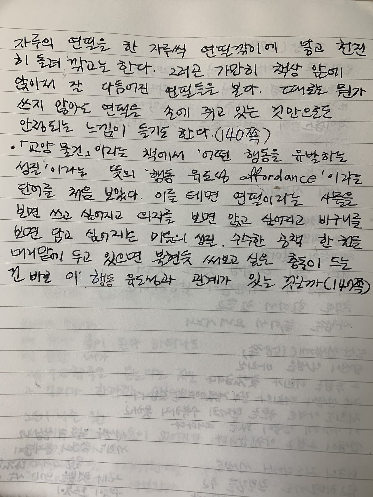 책 내용 중 <교양 물건>이라는 책에 나온다는 ‘행동유도성’이 의미심장하다. 연필을 보면 쓰고 싶어지고, 바구니를 보면 담고 싶어지는 것과 같은 어떤 행동을 유발하는 성질이라는 뜻을 지니고 있다고 한다. 수수한 공책 한 권을 머리맡에 두고 있으면 불현듯 글 쓰고 싶어질 것이라는 저자의 말처럼 나도 블루투스 키보드와 수첩을 항상 가방에 챙겨 넣는다. 언제 어디에서 갑자기 글을 쓰고 싶어 질지 모르니까. 그리고 노트북을 항상 가까이에 두자. 자꾸 보면 쓰고 싶어질 테니까.
