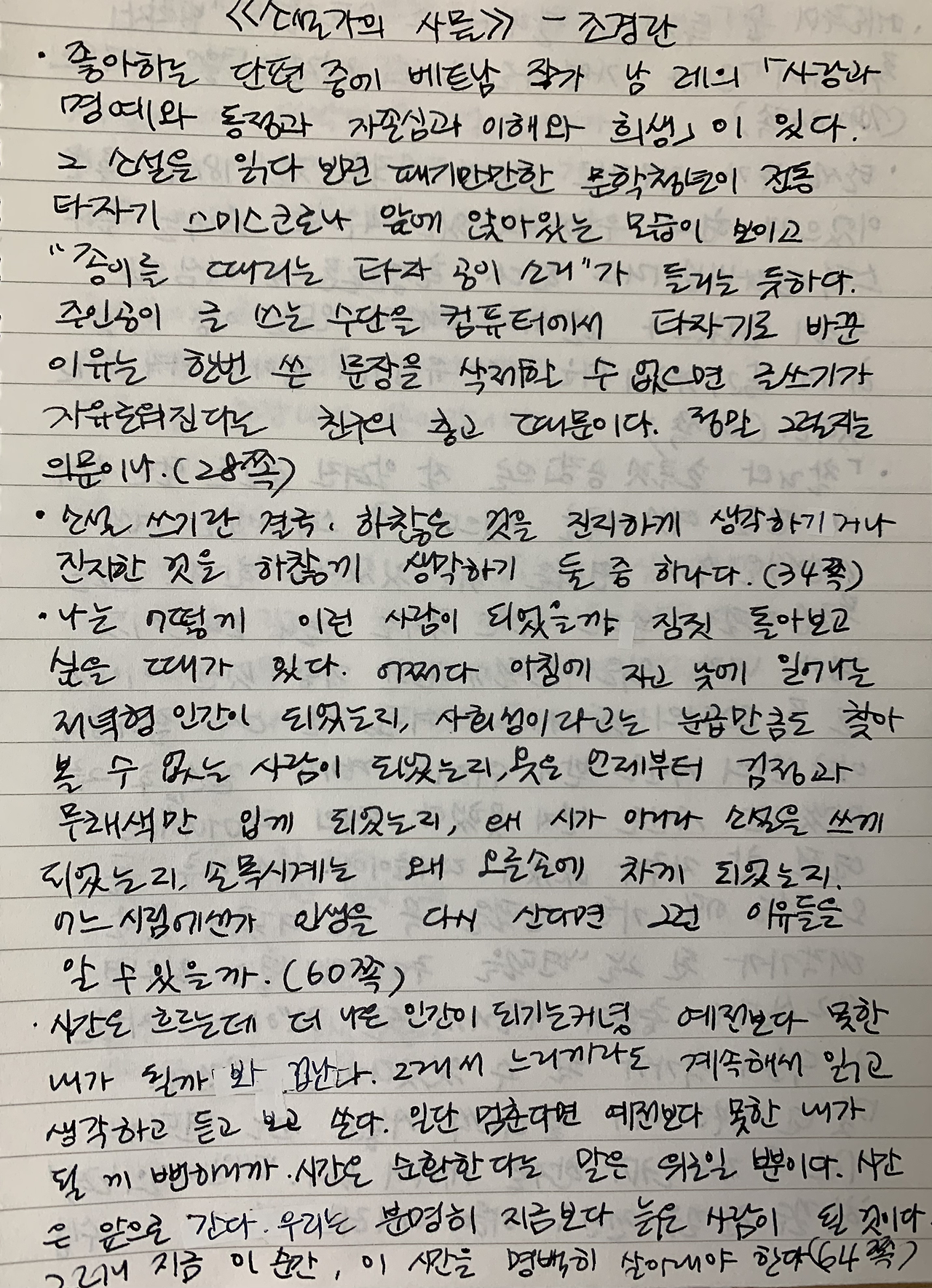 동아일보 신춘문예로 당선되어 그동안 일곱 권의 책을 내었다고 되어 있었으나 나는 아직 한 권도 읽어본 일이 없다. 세상에는 책이 얼마나 많은 것인지. 저자는 이 책을 ‘기대의 책’이라 부른다. 종이와 나무로 만들어진 거의 모든 사물을 좋아한다는 것이 나와 닮았다. 소설가의 눈에는 하찮아 보이는 작은 사물이 글감이 된다. 물건 하나씩으로 하나의 꼭지를 완성하 수 있다는 것이 어떻게 보면 글 쓸 거리가 무궁무진하다는 것이고, 아무것도 아닌 것을 특별한 것으로 바꾸는 것은 시각의 차이임을 알 수 있다. 쓰고 싶은 게 없는 게 아니라 아직 유심히 관찰하고 찾아보지 않은 건 아닌지 돌아볼 일이다.