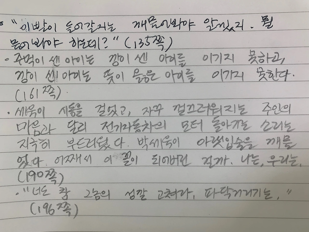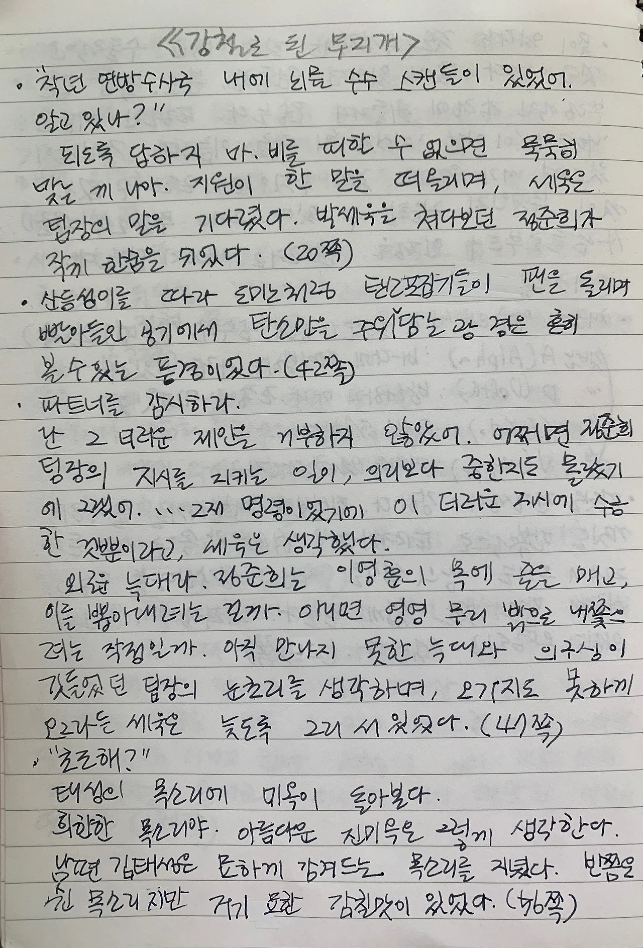 연달아 죽는 사람들은 열람이 금지되어 있고 30년 전 사건과 관계되어 있다는 공통점이 있다. 이야기의 중심에 서 있는 김태성과 진미옥은 과거와 현재의 연결고리가 된다. 사건들이 복잡하게 얽혀 있고, 인물이 많이 등장해 적어 가며 읽었으면 좋았을 텐데 나는 그의 문장들에 더 관심이 갔다. 툭 내뱉는 대사나 문장들이 모두 그렇진 않지만 한 번씩 눈을 반짝하게 만든다.