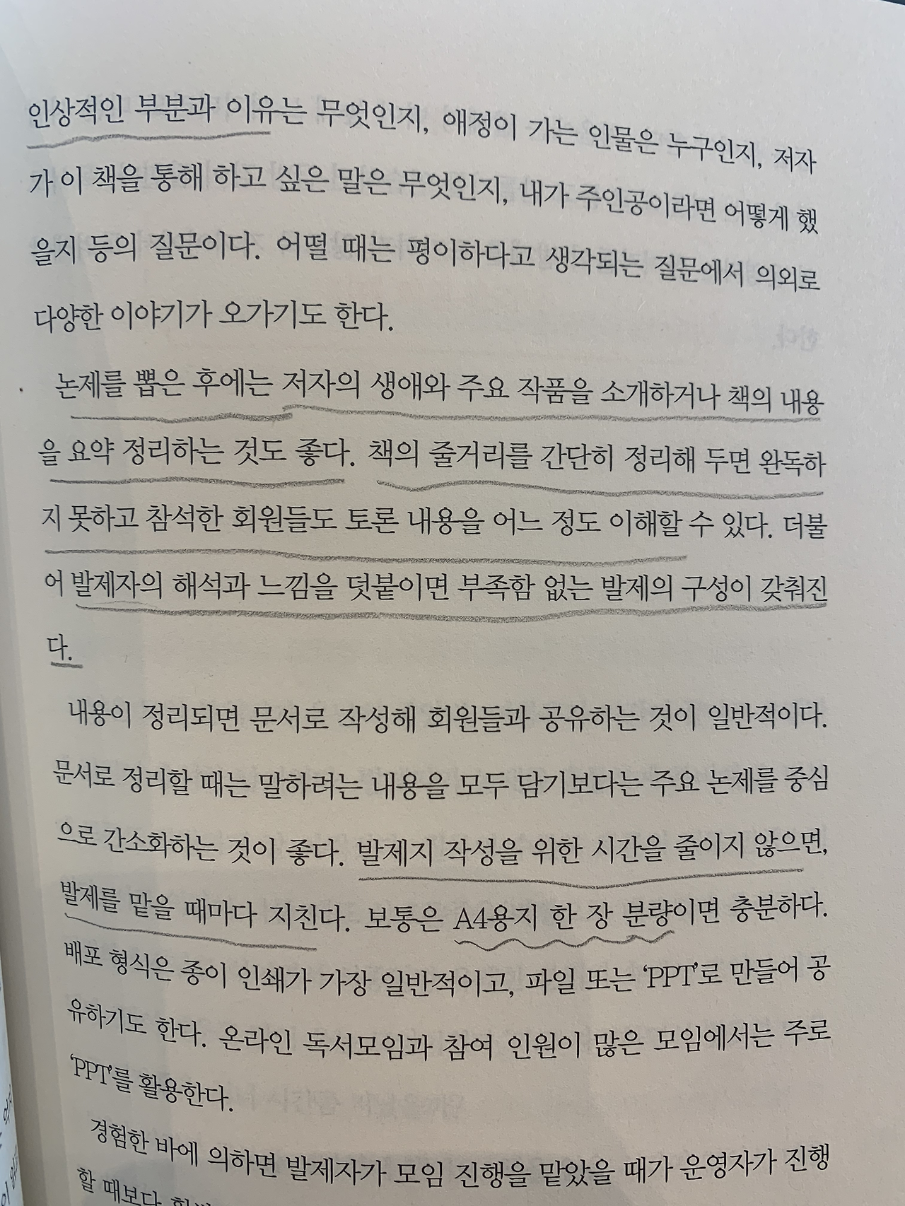 혼자서는 읽기 힘든 책들, 안나 카레니나, 카라마조프가의 형제, 모비딕 등도 읽었고, 역사나 과학, 철학에 대한 것들도 읽었다. 빠트리지 않았다면 지금까지 100권이 넘는 책을 읽고 나눈 것이라 생각하니 뿌듯하기도 하다. 이 책의 저자가 했던 것과 다른 것이라면 따로 발제자를 정하지 않은 것인데 아마도 돌아가며 발제를 했다면 더 많은 것을 깨닫고 느끼고 이루어냈을지 모르겠다. 우리는 읽고 서로가 생각하는 바를 주로 이야기했다. 그러다 보면 질문도 하고, 생각이 다른 점도 알게 되니 발제를 따로 하지 않았을 뿐이지 그에 상응하는 토론을 나름 해 왔던 것 같다. 발제를 누군가가 준비해야 한다면 부담은 되겠지만 독서모임의 꽃이라고 하니 한번 실천해 보는 것도 좋은 방법일 것 같다.