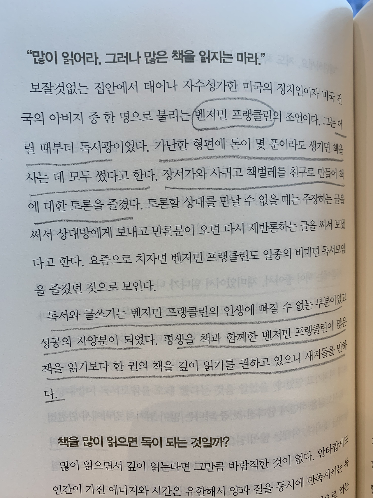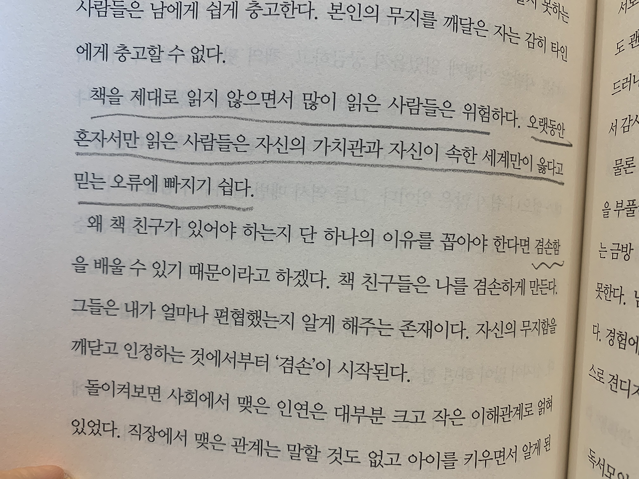 책을 혼자 읽는 것과 다르게 모임에서 함께 나누면 좋은 점이 겸손해지는 것이라고 저자는 말한다. 혼자 읽는 사람, 깊이 있게 읽지 않는 사람들은 아집에 빠져 겸손하지 못하고 부정적인 언어로 다른 사람의 의견을 무시하게 될 수 있음을 주의하라고 말한다. 찔리기도 하고, 절대 그런 사람이 되지 않도록 애써야겠다는 각오도 했다.