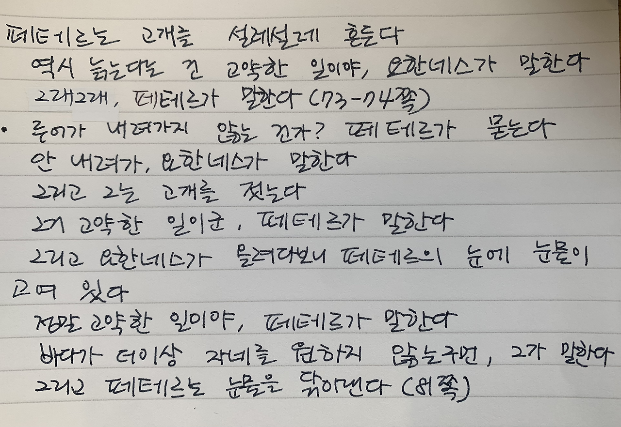 바닷가에서 살았다는 작가의 이야기에는 바다와 배가 자주 등장하나 보다. 작가의 책을 이제 두 권 읽었는데 두 작품에 모두 바다가 많은 비중으로 등장한다. 저자가 살아온 배경은 작품에 큰 영향을 미치는 것 같다. 조금 난해하긴 하지만 요한네스에게 일어나는 일련의 사건들이 흥미로웠다. 내 인생의 아침과 저녁을 생각해보게 하는 책이었다.