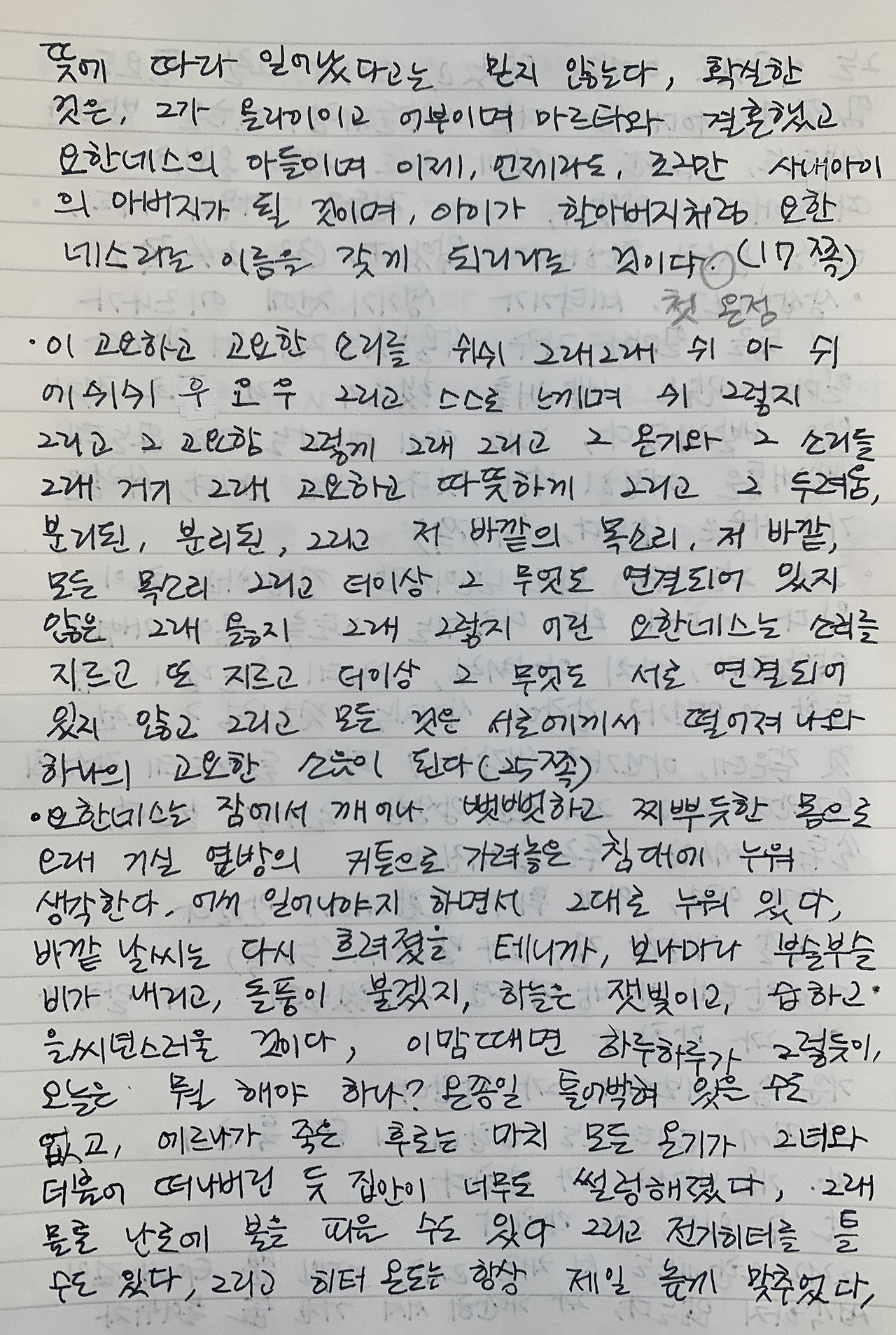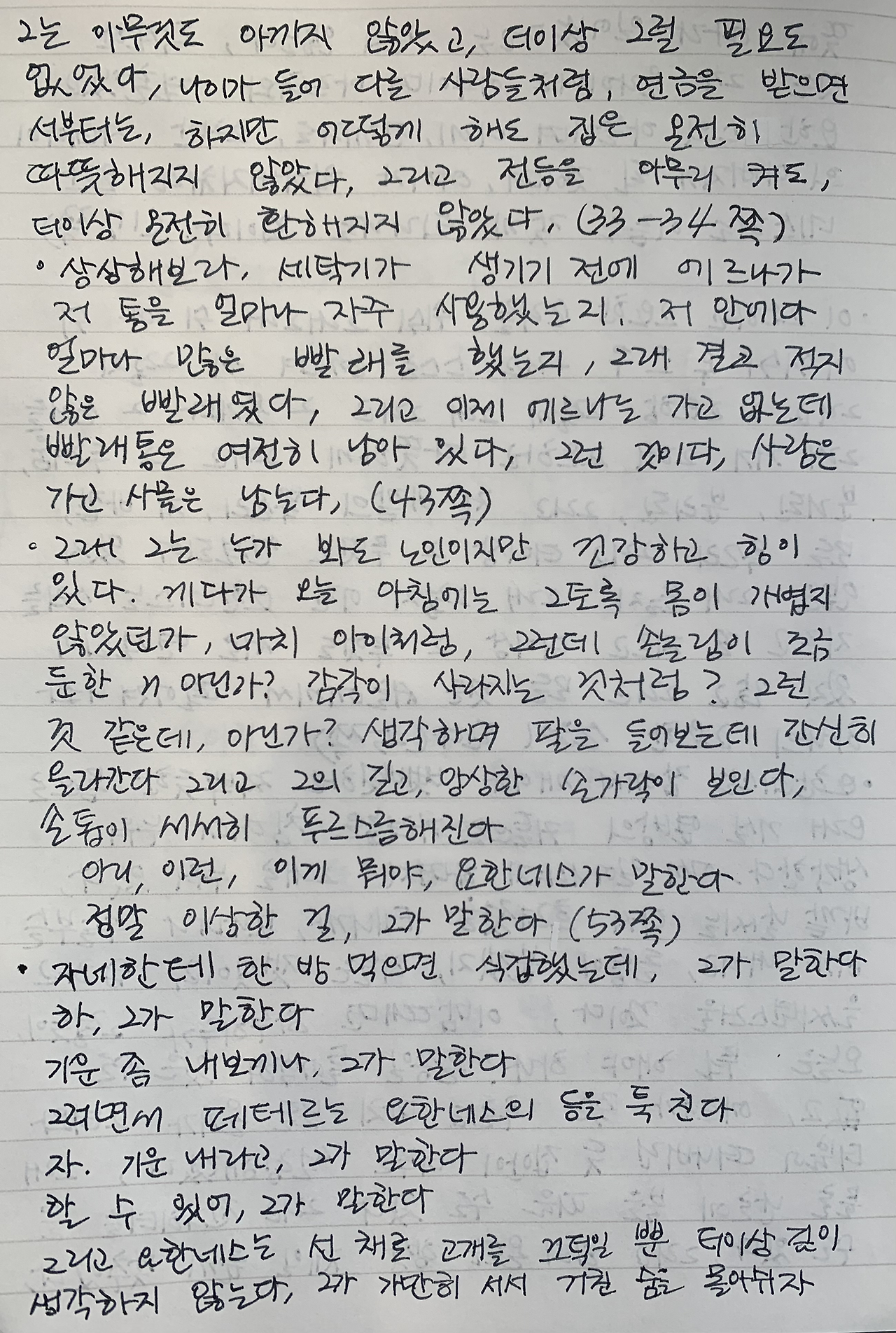 이야기를 읽는 동안 자꾸 이상한 일들이 벌어지는 이유를 짐작해 보았다. 아직 살아보지 못한 노년의 삶은 이런 것일까, 싶기도 했다. 아침에 아내와 식사를 하고 해변으로 가 고기를 잡거나 친구를 만나는 몸이 약해진 것 빼고는 특별한 걱정거리 없는 일상. 노년을 보내는 가장 소박하면서도 모두가 바라는 꿈이 아닐까 한다. 아이들을 다 키운 요한네스 역시 이런 노년을 보냈다. 아내가 죽기 전까지. 어느 날 아침 똑같이 잠에서 깬 그는 이상한 경험들을 한다.