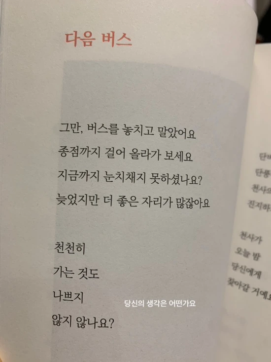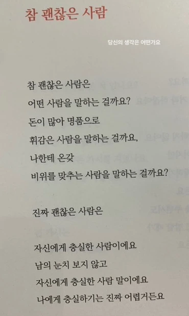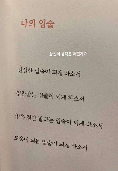 시들은 대부분 물음으로 시작한다. 무언가를 한 적, 본 적, 생각해 본 적 있는지 물은 다음 그에 대한 자신의 생각을 말하는 형식이다. 욕심을 내려놓고 예수님을 의지하라는 것이 주된 메시지였다. 받은 사랑을 베풀고, 감사하며 살라는 평범한 메시지가 딸이 그린 따뜻한 그림과 어우러져 읽는 동안 편안하고 행복했다.
