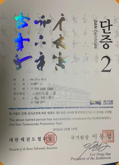 시계를 잘못 보고 저녁 준비를 한참동안 하다가 퇴근한 남편이 월요일인데 태권도 안 갔느냐는 물음에 그제야 시계를 보니 수업 시작 10분 전이었다. 저녁밥도 먹지 못하고 얼른 도복으로 갈아입고 도장으로 갔다. 차를 대고 올라가니 선수부 아이들이 쉬고 있었다. 체조와 다리 찢기를 했다. 다시 수업을 시작하기 전 사범님이 2단 단증과 새 띠를 주셨다. 아이들이 박수를 쳐 주었다. 이제 2단이라는 게 실감 난다.