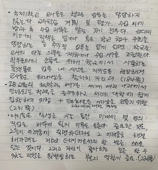 교육계획을 수립하고 평가를 추후에 만드는 기존 방식과 다르게 IB 평가는 학생들이 습득해야 할 지식과 개념, 기술을 정의하고 평가계획을 수립한 후 그에 맞는 학습을 계획한다. (152쪽) IB를 채택한 국제학교 교사들은 행정 업무를 담당하지 않는다고 한다. 오직 수업을 계획하고 평가를 하며 방과후수업 정도만 맡는다고 한다. 추가적인 업무를 맡게 되면 수업 시수를 조정한다고 한다. 수많은 업무에 시달리는 일반 학교의 교사와는 다른 면이다.