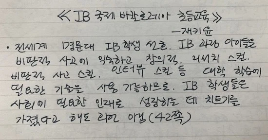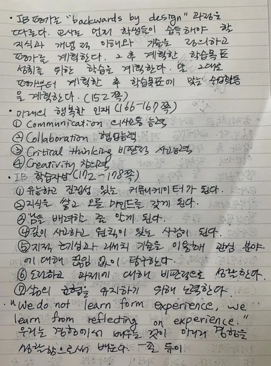 궁금한 마음에 도서관에서 이 책을 빌려와 읽었다. 세계 명문대에서 IB 학생들을 선호한다는 말이 있었다. 비판적 사고에 익숙하고, 창의적이며 리서치 스킬, 판단적 사고 스킬, 인터뷰 스킬 등 대학 학습에 필요한 소양을 이미 갖추었다고 생각하기 때문이라고 한다. 이는 대학뿐 아니라 사회생활을 하는 데 있어서도 필요한 소양이다. (42쪽)