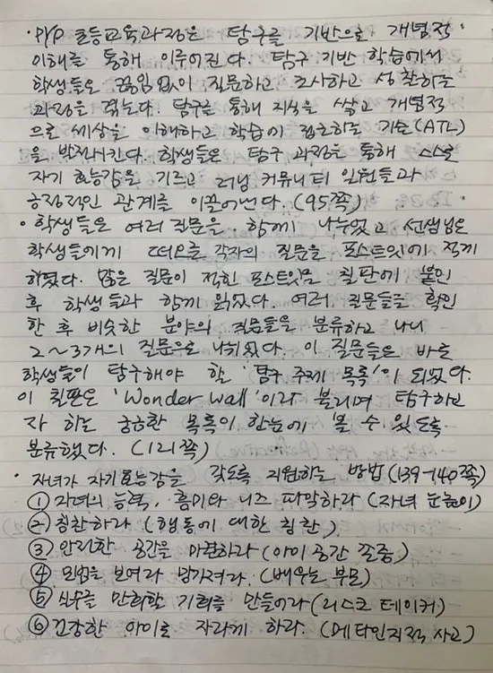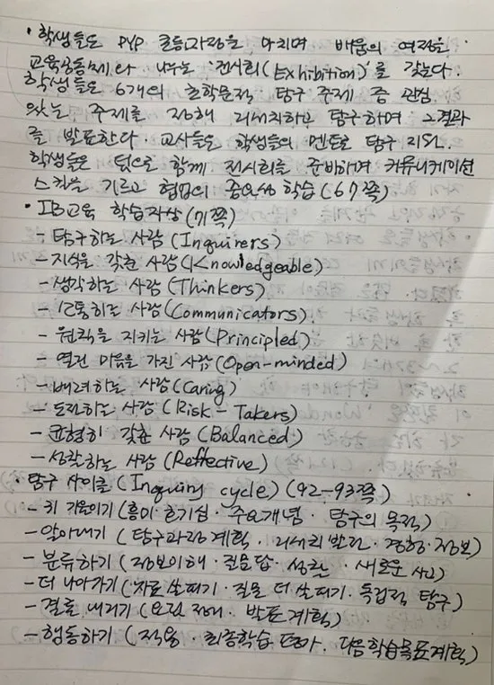 책으로 이해되지 않는 부분이 있어 영상을 몇 개 더 찾아보았다. 내용 중 이미 학교에서 실시하고 있는 부분(프로젝트 수업, 수업내용 관련 전시회 등)도 있었다. IB를 다루지 않는 학교에서도 도입하면 좋을 것 같다. 좋은 점도 많겠지만 약점도 분명 있을 것이다. 미래를 살아갈 아이들은 우리가 받은 교육과는 달라야 하는 것은 명백하다. 많은 이들이 연구하고 있으니 앞으로 우리나라에 맞게 잘 도입될 거라 믿는다.