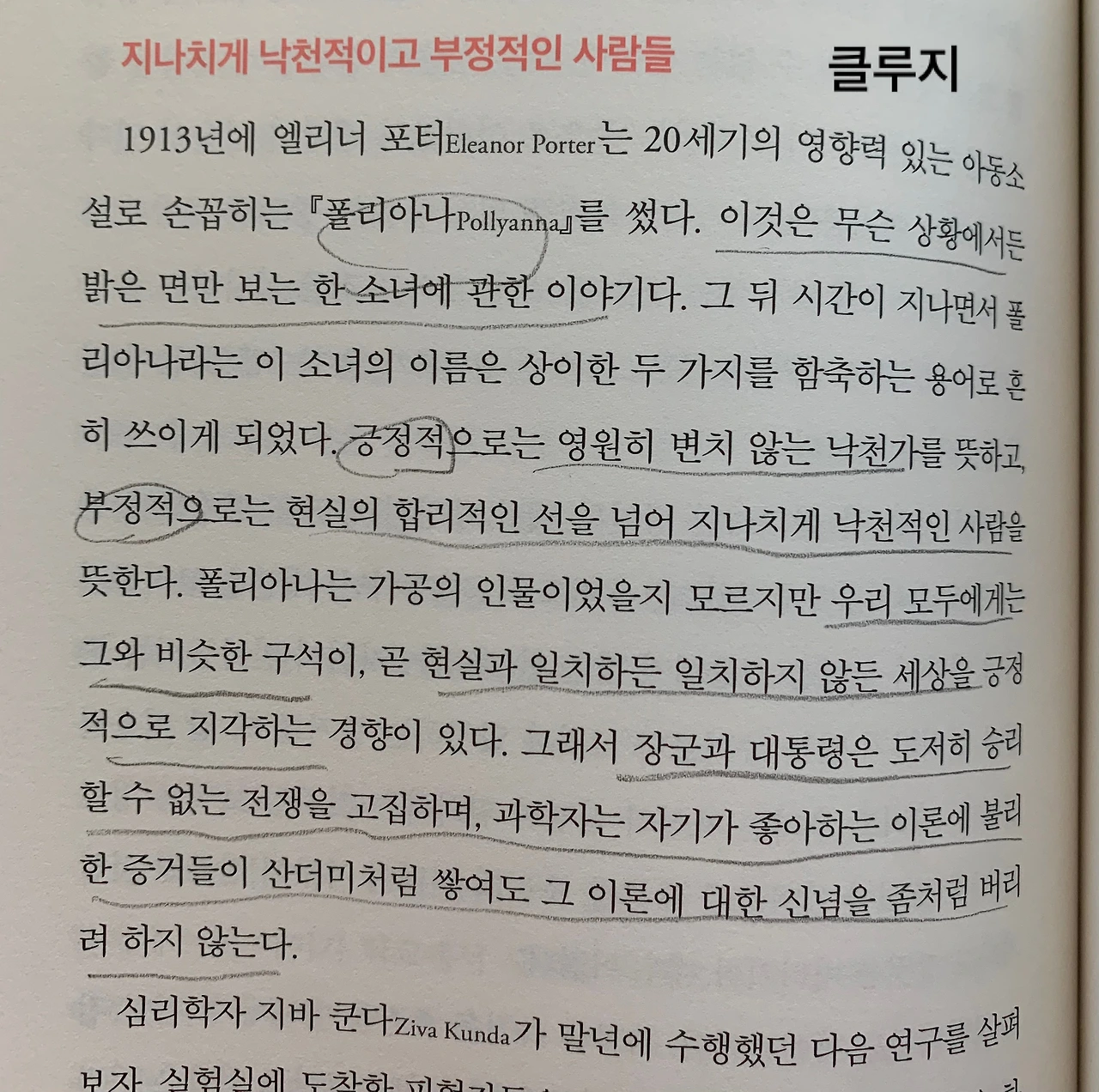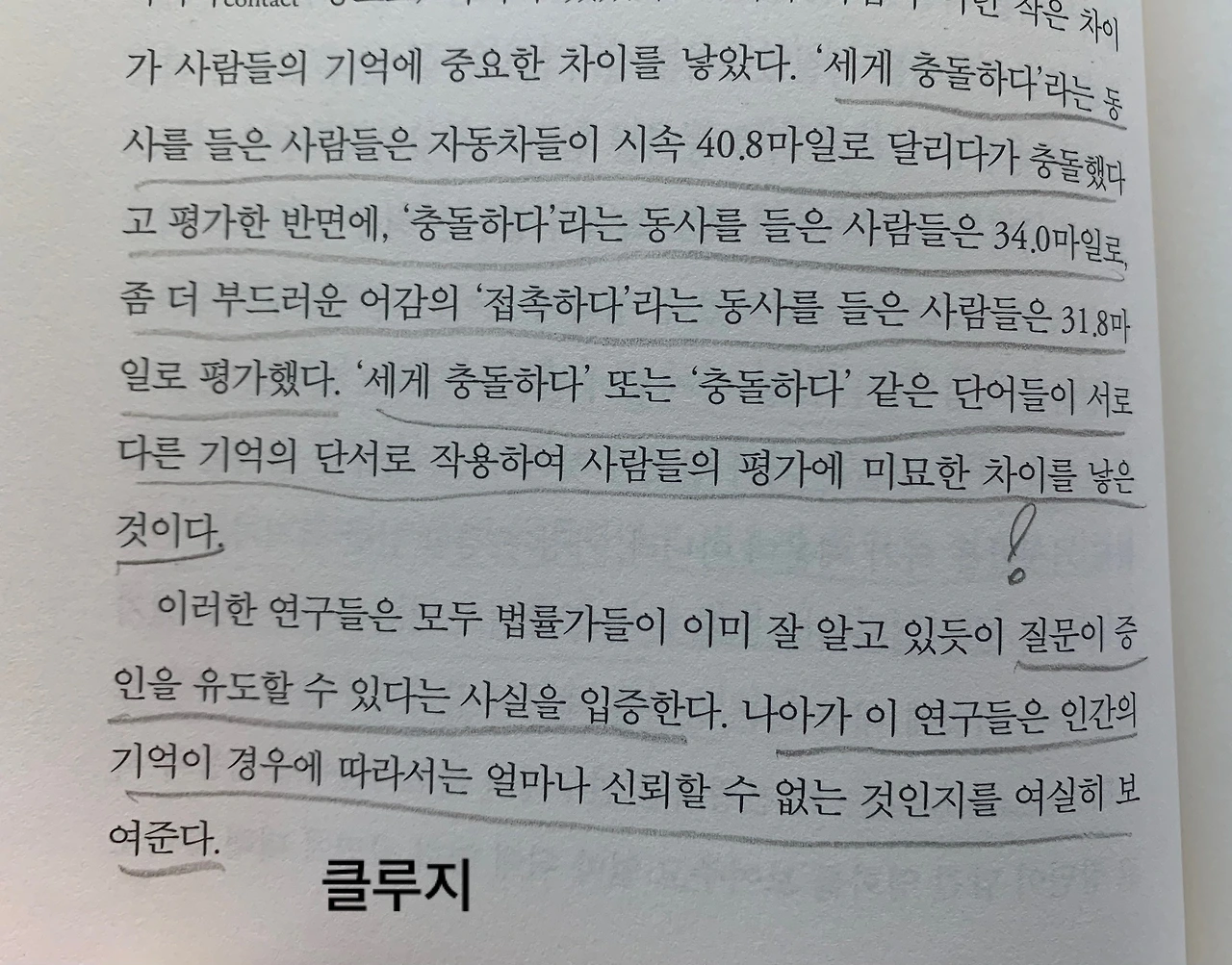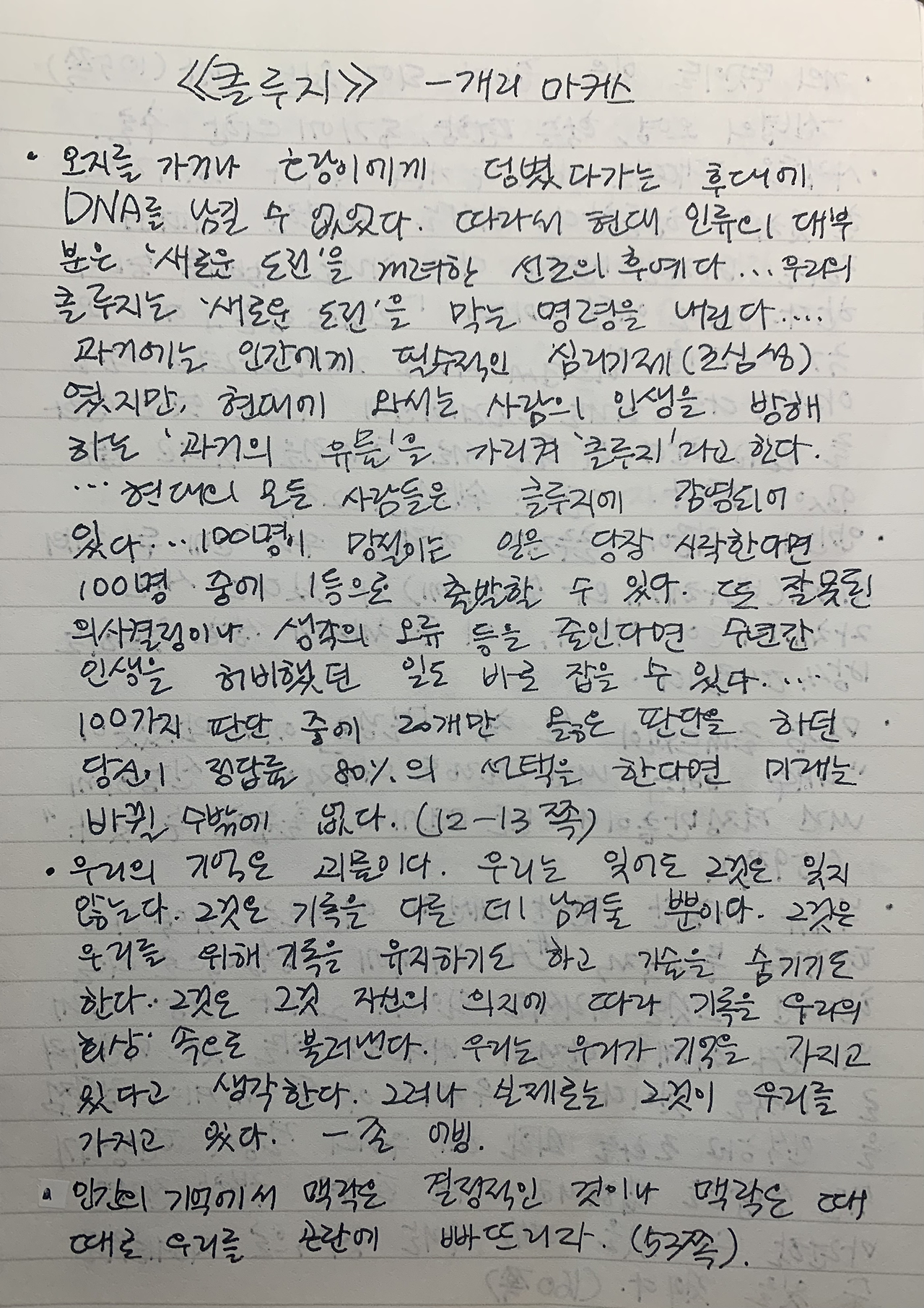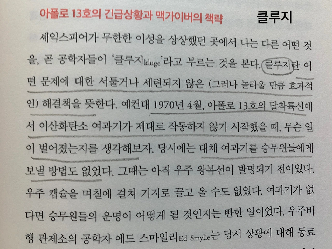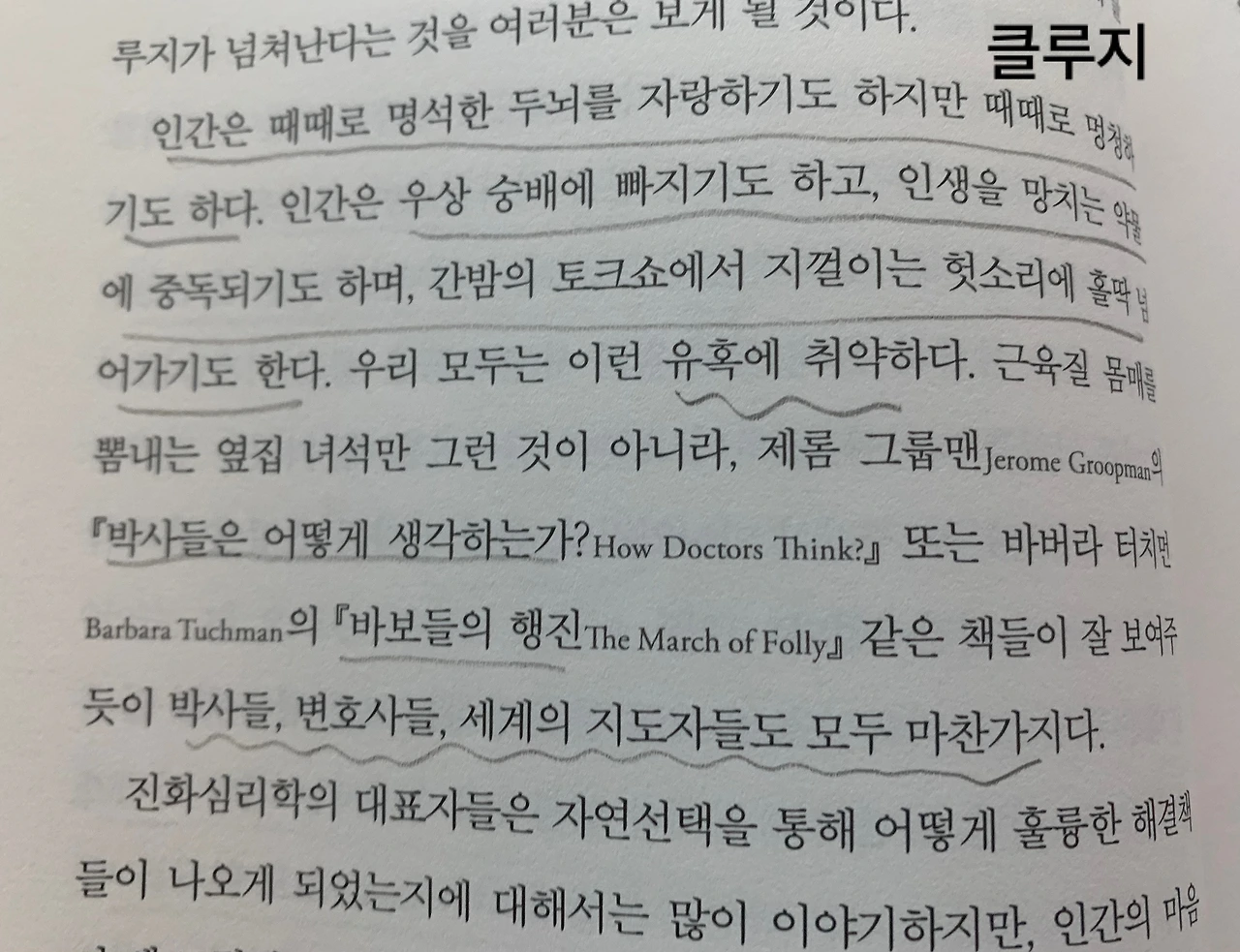 다른 이에게 좋은 책이 나에게는 꼭 그렇지 않은 경우가 있다. 역행자를 쓴 자청님이 적극 추천한 책인데 나에게는 울림이 크지 않았다. 심리를 다루었다는 면에서는 좋았으나 책의 주장에 모두 동의할 수는 없었다. 이 책은 인간의 심리를 진화론적 관점에서 보고, 클루지를 ’과거에는 필요했지만 현대의 사람들에게는 오히려 인생을 방해하는 과거의 유물을 일컫는 말‘로 정의한다. 현대의 모든 사람은 클루지에 감염되어 있으므로 이를 극복하여 100개 중 스무 가지만 올바른 판단을 한다면 미래가 바뀐다고 저자는 말한다.(12-13쪽)