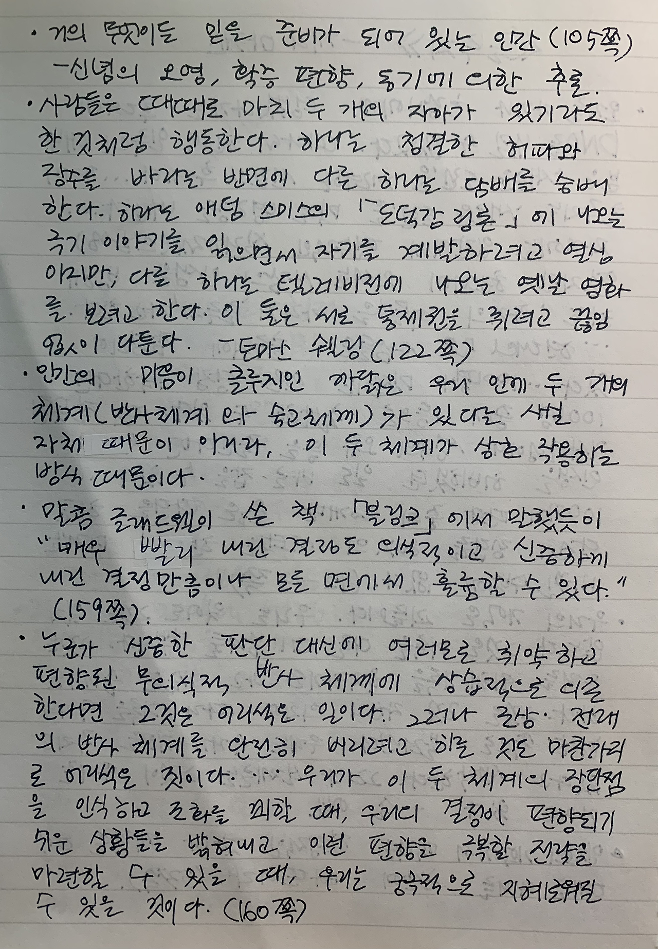 우리 안에는 두 개의 체계, 즉 반사체계와 숙고체계가 있어 상호작용하며, 숙고한 결정이 반드시 훌륭하지만은 않다고 말콤 글래드웰이 <블링크>에서 말했다. 저자는 둘의 장단점을 인식하고 때에 따라 조화롭게 사용하여 궁극적인 지혜를 발휘하라고 하였다.(160쪽)