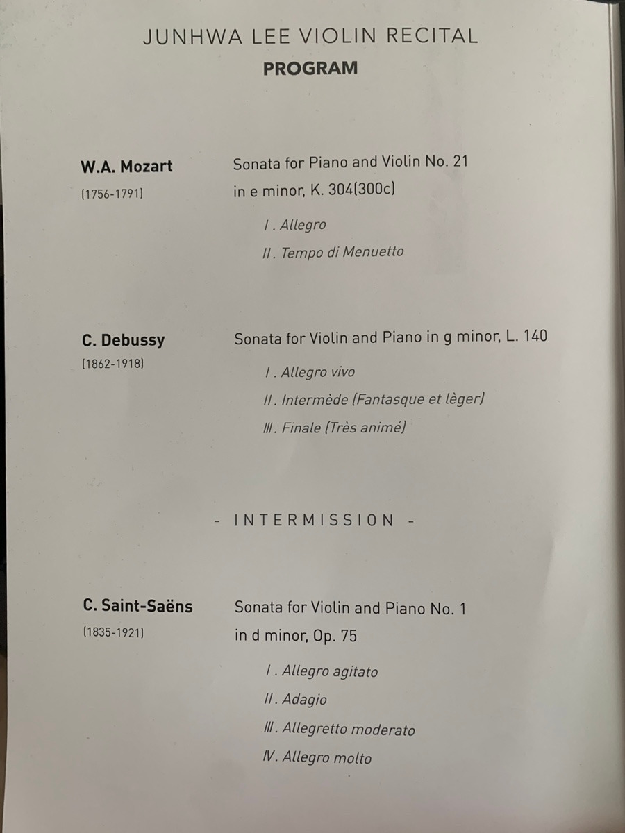 드뷔시의 곡은 들을 때마다 난해하다. 몽환적인 곡. 드뷔시 피아노 곡은 좋은데 바이올린 곡은 범접하기 어려워 보인다. 생상은 그에 비해 조금은 예스러운 데가 있어서 듣기에 좋았다. 소리의 색깔이 마음에 들었다. 줄을 뭘 쓰나 자세히 보니 G 현은 노란색, A, D 현은 초록색으로 보였다. 마치고 어떤 줄을 사용하시는지 여쭤보고 싶었다.