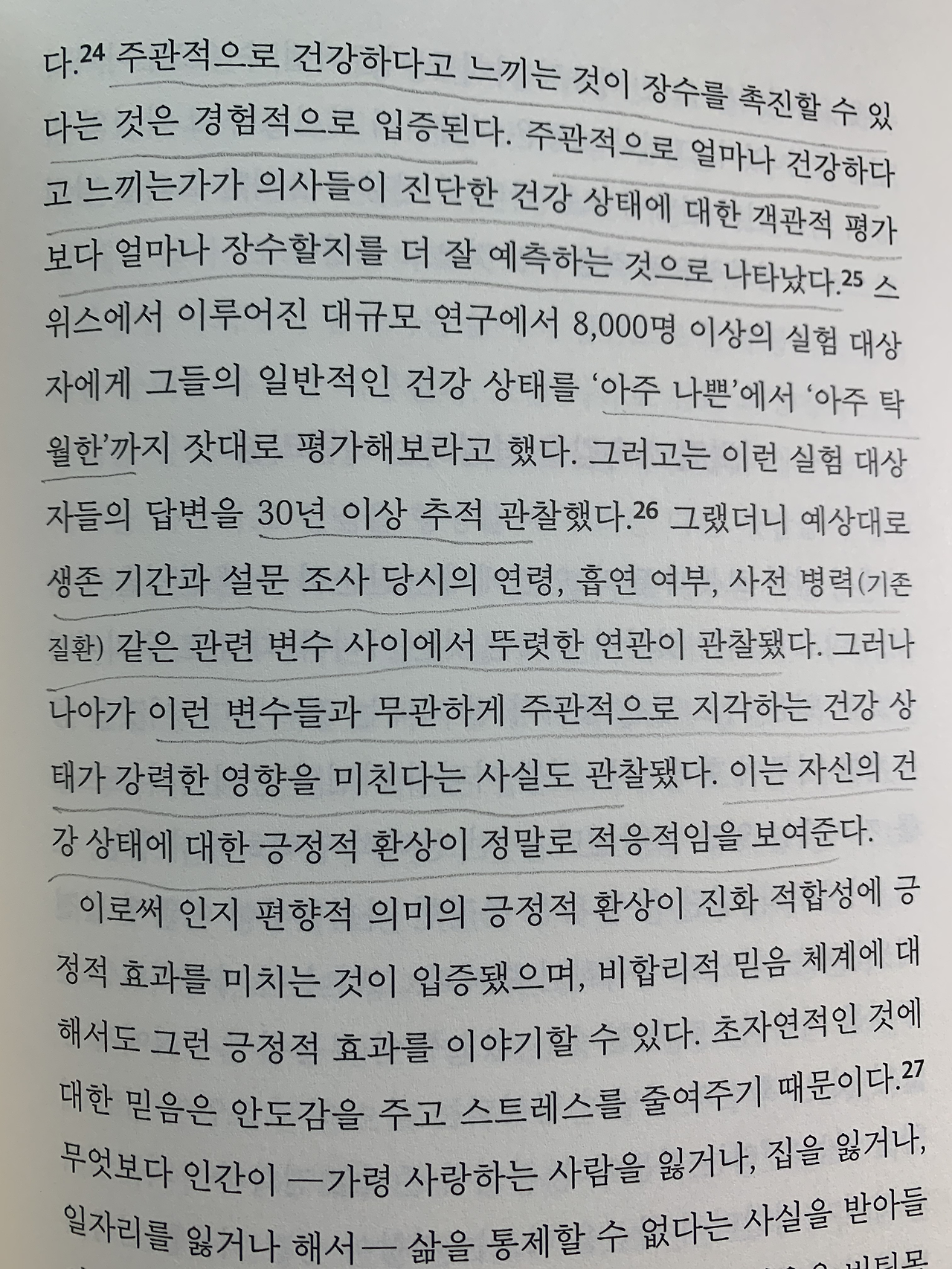 하지만 이런 믿음이 모두 어리석다고 생각하면 안 된다. 주관적으로 건강하다고 느끼고 믿는 것이 장수를 촉진한다는 연구 결과가 있다고 저자는 말한다. (155쪽) 건강 여부에 대한 여러 변수들과 상관없이 주관적으로 지각하는 건강 상태가 실제 건강에 강렬한 영향을 미친다는 것이다. 자시니 건가에 대해 긍정적 환상을 가지고 있으면 실제로도 건강하게 살 확률이 높다고 한다. 이는 건강에 대해서뿐 아닐 것이다. 자신의 지능, 능력, 믿음 모두에 적용되지 않을까?
