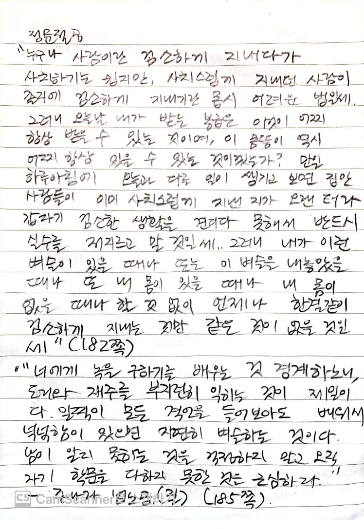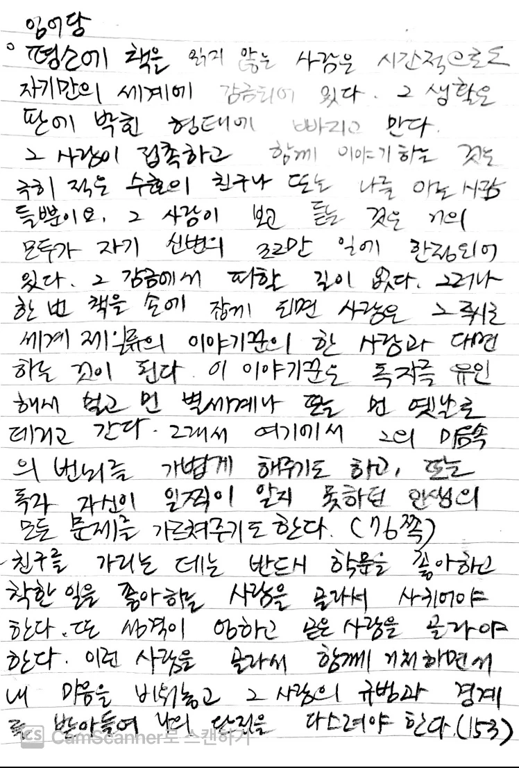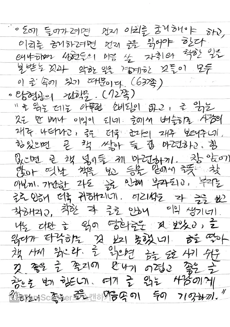 처음 배우는 사람들이 자주 묻는 물음에 기반하여 남에게 도움을 주기 위해 자기 마음을 세우는 것, 몸소 실천할 일, 부모 섬기는 법, 남을 대하는 방법을 적고 ‘격몽요결’이라 이름한 이 책은 이후 수백 년 동안 살아남아 오늘 내가 읽기에 이르렀다. 이렇게 오래 사랑받는 책을 쓰기 위해서는 남을 진심으로 위하는 마음으로 임해야 한다는 교훈을 얻을 수 있었다.