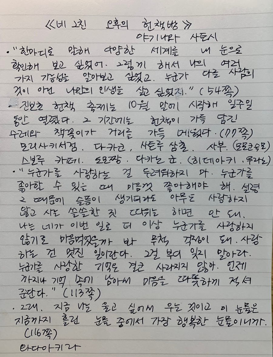 책을 읽다 보니 진보초 헌책방 거리에 가보고 싶다는 생각이 들었다. 앞으로도 도쿄는 가고 싶지 않을 줄 알았는데 10월 말부터 일주일 동안 열리다는 진보초 헌책 축제에 가보고 싶어질 줄이야. 책은 마음을 움직이게 한다.