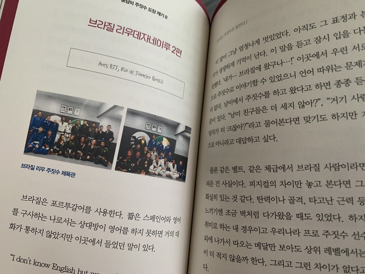 태권도를 하는 입장이라 부상에도 무도를 놓지 못함을 이해할 수 있다. 나도 승단심사나 대회를 앞두고 꼭 크고 작은 부상을 입는다. 그럼에도 대회장에서는 아픔을 잊을 정도로 최선을 다해 임하곤 한다. 한국에 돌아와 병원에서 MRI를 여러 번 찍고 발목 수술을 할 정도로 많은 부상을 입었지만 미련스러울 정도로 꾹 참아 가며 매트 위를 굴렀던 저자가 존경스럽기까지 하다. 여행을 하고 돌아오면 여행지의 내가 진짜 나였나 싶을 정도로 꿈같을 때가 있다. 저자는 오래 머물렀으니 더 그랬을 것 같다. 돌아온 한국에서의 삶도, 다시 떠나게 되는 날도 언제나 행복하기를, 그리고 운동을 지속할 수 있도록 다치지 않기를 바란다.