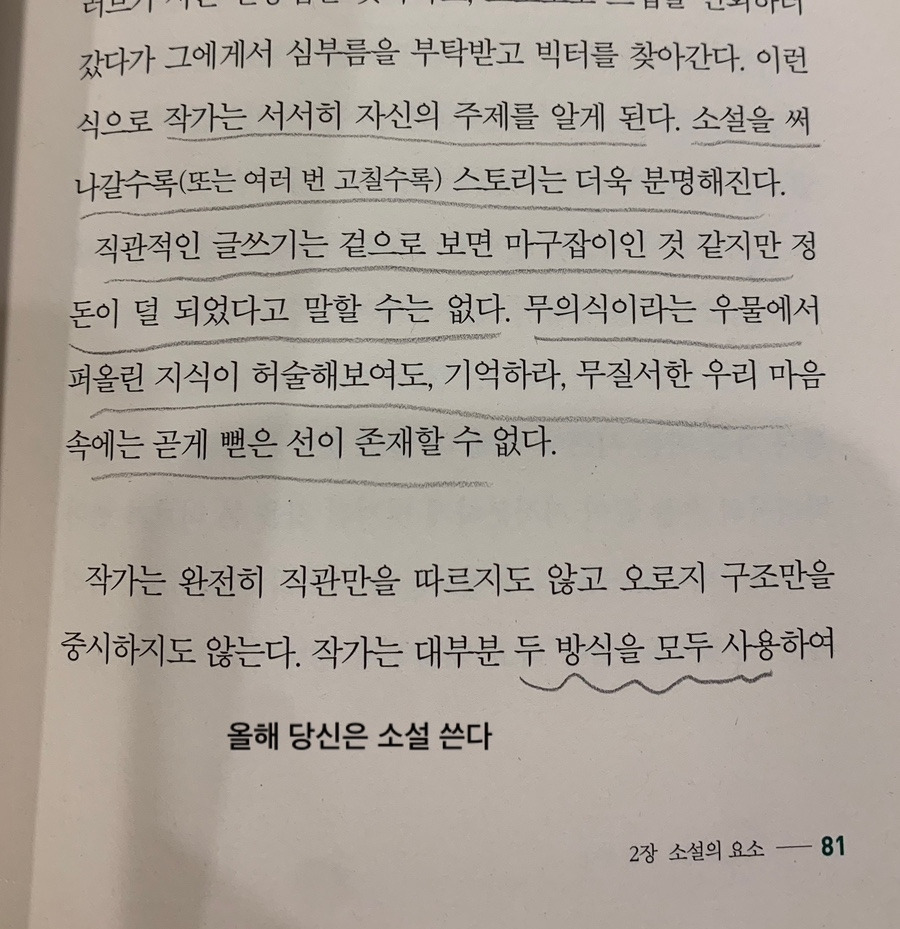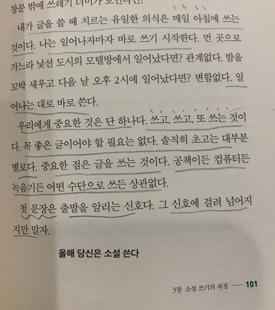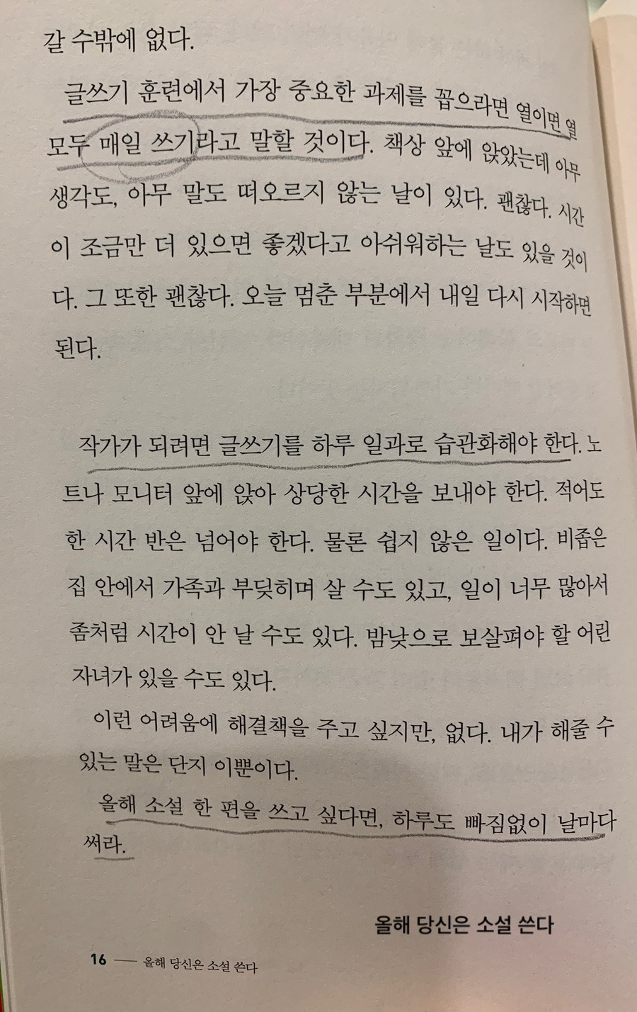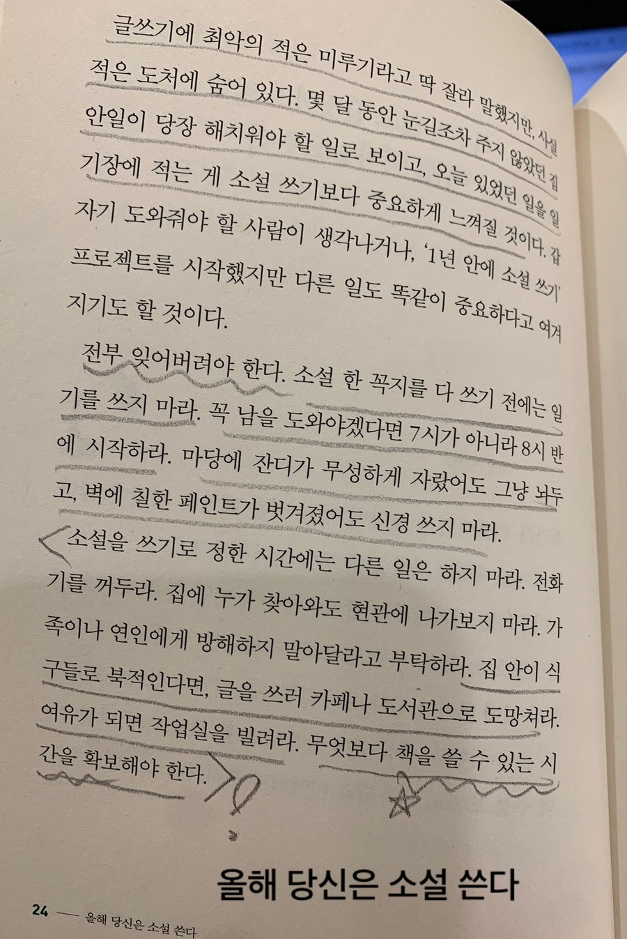 저자는 많은 소설을 썼다. 그럴 수 있었던 건 20년이 넘도록 매일 아침 글을 쓴 덕분이다. 무엇이든 꾸준함에 따를 것이 없다. 휴일도 없이 매일 아침에 글을 쓰면 어떤 기적도 일어날 것 같다. 눈 뜨면 글부터 쓴다는 저자를 따라 똑같이 할 수는 없겠지만 매일 쓰라는 말은 명심할 것이다. 책 쓸 시간을 확보하는 일이 무엇보다 중요하다.