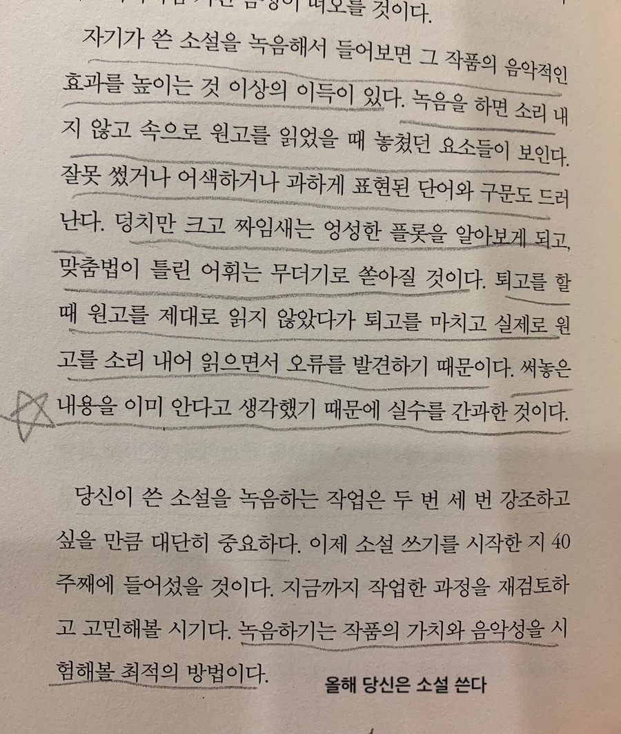 자기가 쓴 소설을 처음부터 끝까지 녹음해서 들어보라는 충고가 가장 기억에 남는다. 앞으로 한번 실천해보고 싶다. 작품의 가치와 음악성을 시험할 좋은 방법이라고 저자는 말한다. 쉽진 않겠지만 효과적일 것 같다. 원어로는 어떻게 표현했을지 점점 궁금해진다. (이유는 모르지만 하루키의 달리기 책도 영어 원서에 더 혹해서 달리기 시작했다.)