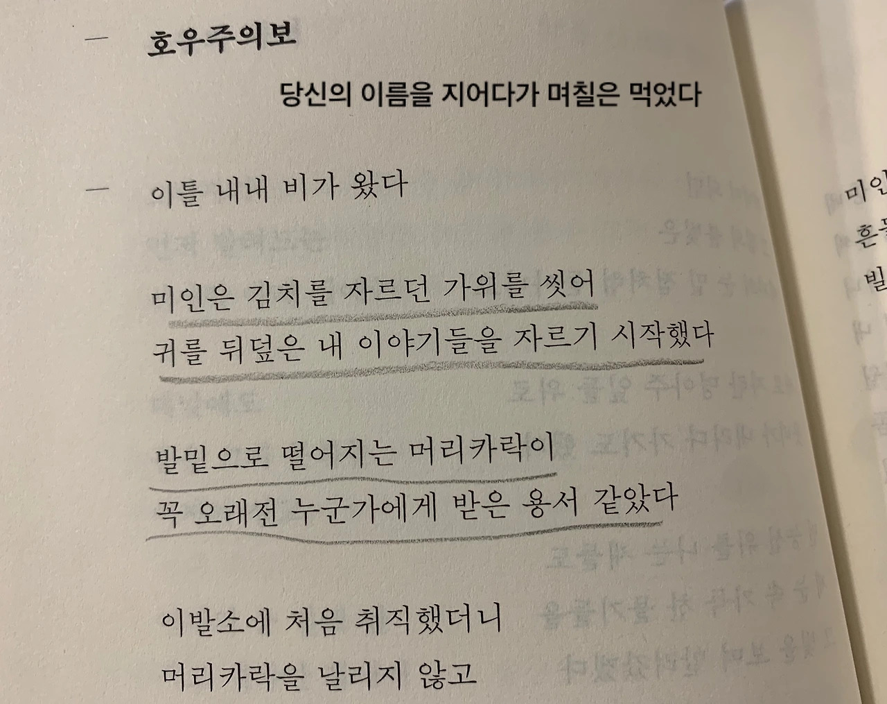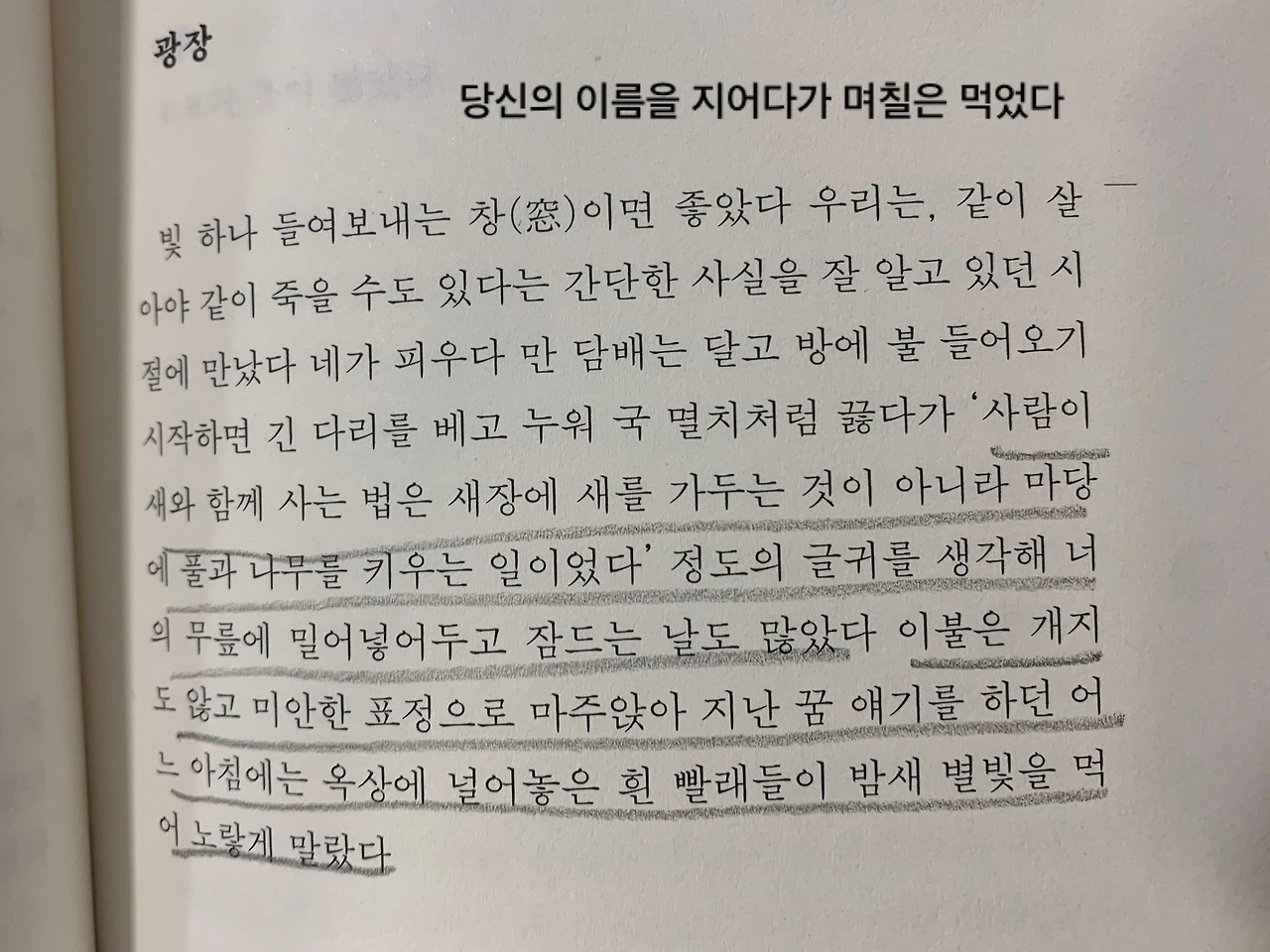지난 주말 박준 시인의 강의를 들었다. 이렇게 유명하고 훌륭한 글을 쓰는 분을 이제라도 알게 되어 다행이라고 생각했다. 그날 받음 시집을 들고 다니며 읽었다. 밑줄 그을 곳이 많았다. 언어의 마술사라는 상투적인 칭찬으로는 부족한 시였다. 아픔과 고민의 흔적들이 진액으로 남아 큰 울림을 준다.
