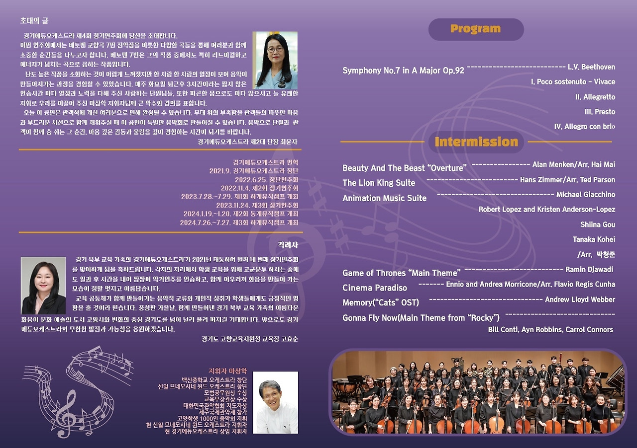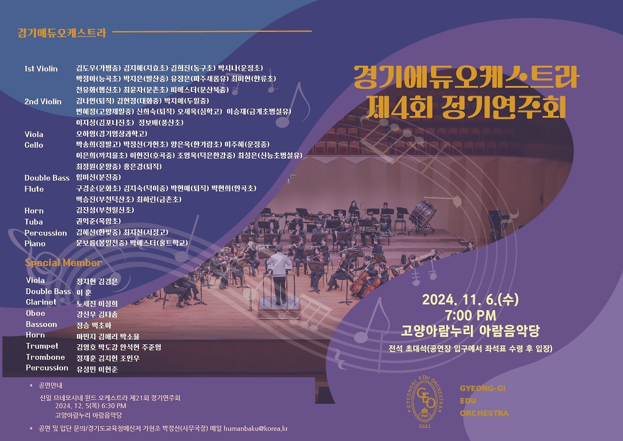안녕하세요? 저는 경기 북부지역 교육가족으로 구성된 경기에듀오케스트라(제가 알기로는 경기 북부지역 유일한 교사 오케스트라)에서 악장으로 활동하고 있는 교사입니다. 2021년 코로나가 한창일 때 몇 명의 교사가 의기투합하여 창단한 저희 오케스트라가 매년 성장하여 11월 6일 수요일 저녁 7시에 고양 아람누리에서 제4회 정기공연을 합니다.
