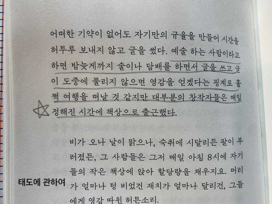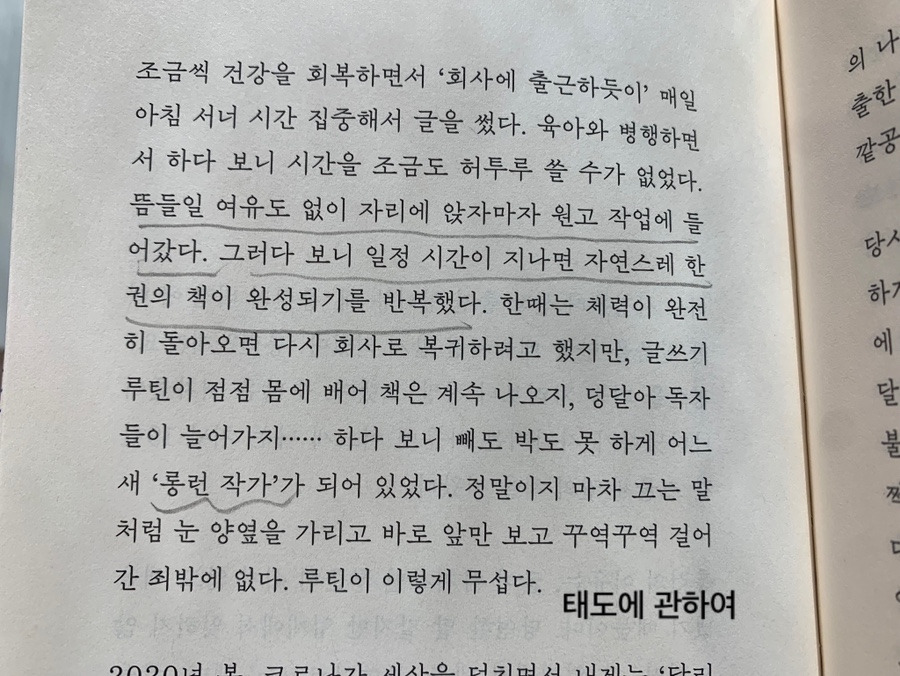 그동안 스무 권이나 되는 책을 회사 생활하듯 카페에 출근하다시피 하며 썼다는 것을 새로워진 ‘태도에 관하여’를 읽고 알게 되었다. 아침부터 오후까지 하루 종일 한 카페에 앉아 여러 권의 책을 쓴 그녀는 어느 날 돌연 카페를 정리하고 시골에 가서 카페를 열 예정이라는 청천벽력과도 같은 말을 듣고 고민에 빠진다. 앞으로 어디에서 글을 써야 하나 막막했을 것 같다. 이후 조금 멀지만 글쓰기 좋은 카페를 발견했다. 나도 장소를 바꿔 가며 글을 써 왔는데 특별히 잘 써지는 곳이 있으면 좋겠다 싶었다. 그래서 우리 동네에서 아마도 처음 생겼던 카페에 와서 앉아 이 책을 마저 읽고 글을 쓴다. 11년 동안 없어지지 않았음에 감사하며. 앞으로 이곳에 출근해서 글을 써 볼까 한다.