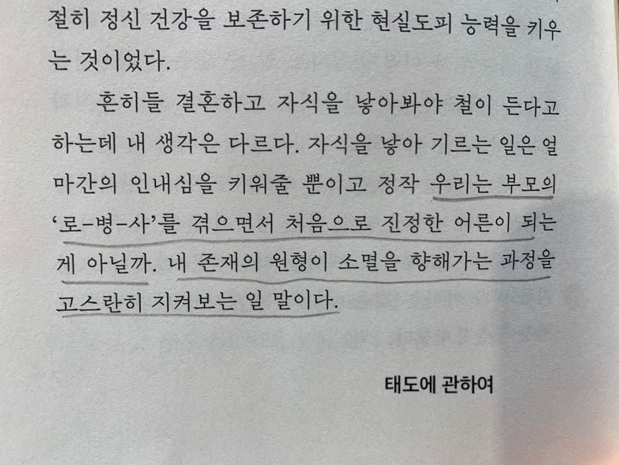 책의 내용 중 가장 인상 깊은 부분은 아프셨던 아버지의 마지막에 대한 글이다. 예쁘고 귀엽기라도 한 아이 돌보기도 쉽지 않지만 부모를 돌보는 일에는 더 많은 고민과 갈등, 특히 죄책감이 있다는 말에 공감이 갔다. 아이를 낳는 것이 어른이 되는 길이 아니라 나이 드신 부모님을 바라보며 인생의 마지막을 알아가는 이가 진정한 어른이라는 말.