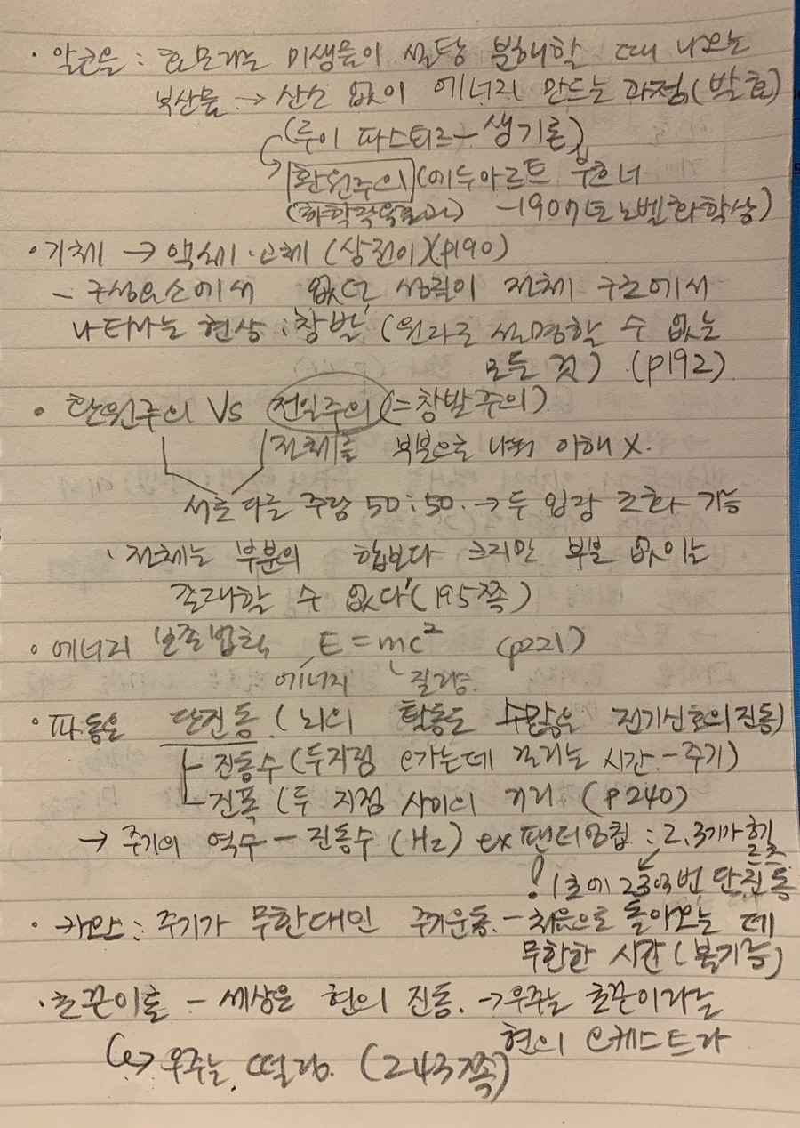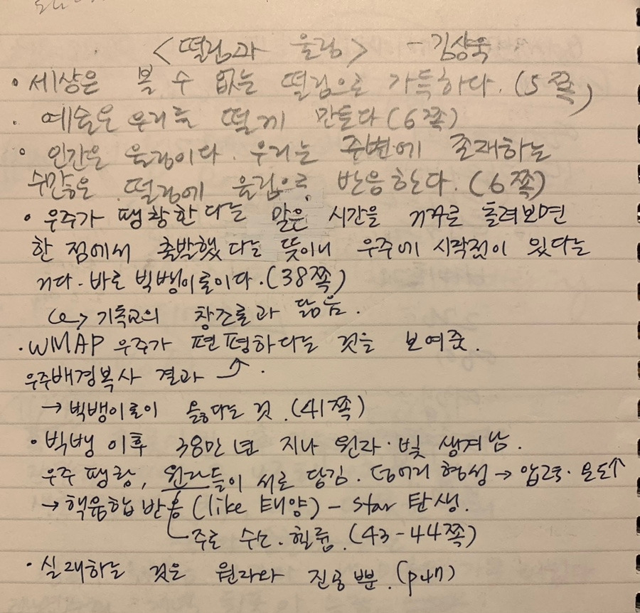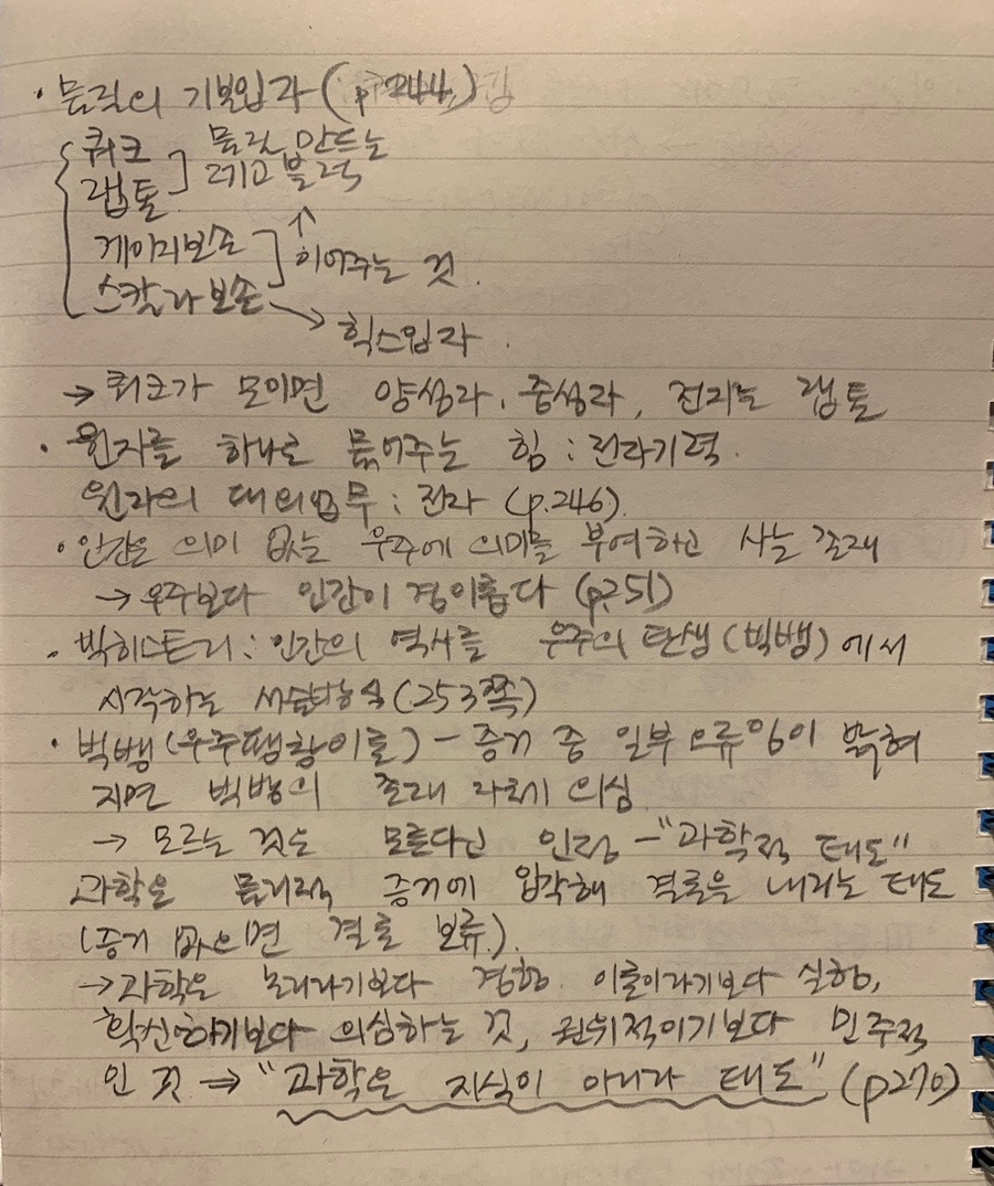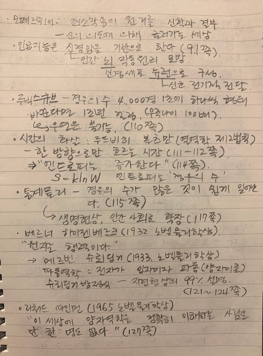 그동안 손에 꼽을 만큼 읽은 과학책 중에도 아주 어려운 책에 속한다. 고등학교 때 물리 반이었던 나는 우리말인데도 이해하기 어려운 내용들을 꾸역꾸역 기록해 가며 읽었다. 이번 달 인문학모임 책이기 때문이다. (아마도 그렇지 않았으면 읽다 던졌을지도 모른다.)