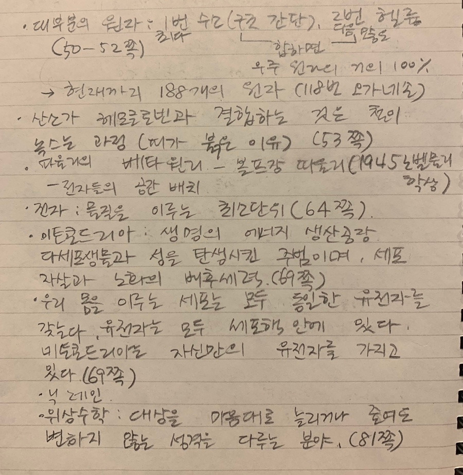 책에는 생물에 대한 내용도 상당 부분 들어있다. 산소가 헤모글로빈과 결합하는 것이 철이 녹스는 과정이고 피가 붉은 이유라는 것을 처음 알았다. 우리 몸을 이루는 세포가 모두 동일한 유전자를 갖고 있으며 유전자는 모두 세포핵 안에 있다는 것, 미토콘드리아는 자신만의 유전자를 가지고 있음을 알았다.