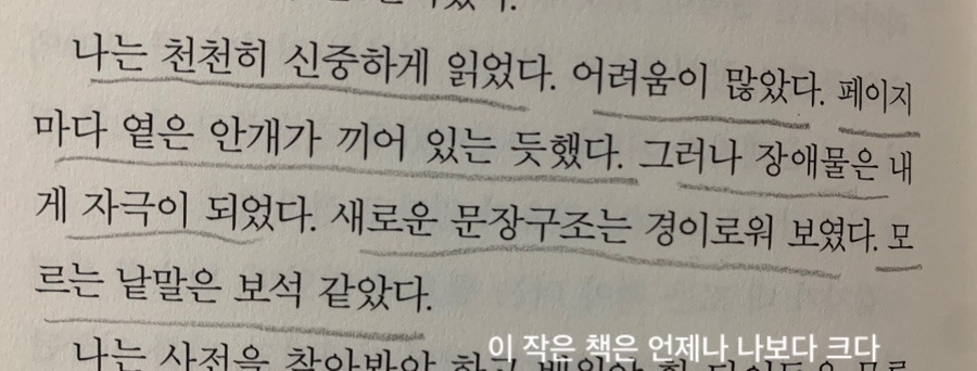 영어 공부를 오랫동안 조금씩 해오고 있는 나는 그녀의 열정에 자극받았다. 읽다 만 영어책을 꺼내 계속 읽기도 했다. 나도 영어책만 읽어볼까? 한동안 나에게도 그런 영어 몰입의 시기가 있었다. 1년간이었지만 영어 책만 읽으려고 노력했고, 그때 영어 실력이 눈에 띄게 늘긴 했다. 무엇이든 그렇겠지만 언어는 꾸준히 하지 않으면 퇴보하기 마련인 것 같다. 다시 영어를 공부할 마음을 먹으니 아득하기만 하다.
