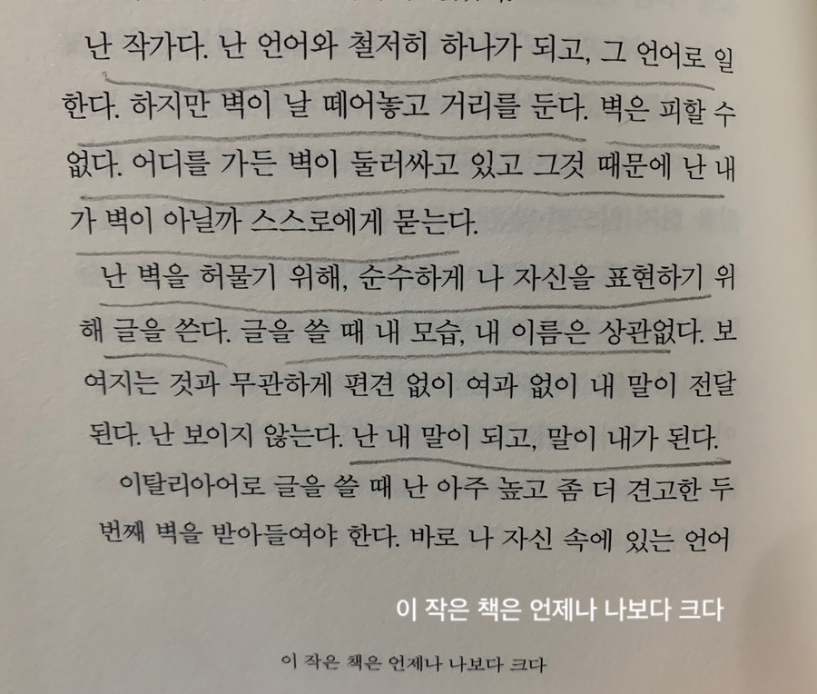 그걸로 끝이 아니었다. 이탈리아어에 대한 사랑이 시작된 후 새로운 언어에 대한 공부를 하게 된다. 한동안 글은 영어로 쓰고, 책은 이탈리아어로만 읽는 시간을 보낸다. 그 시간 동안 공부하느라 겪는 어려움에도 얼마나 행복해했는지 문장들을 통해 알 수 있었다. 그녀는 세 개의 언어를 삼각형 꼭짓점으로 생각한다. 그중 가장 익숙한 것은 단연 영어이겠지만 그녀의 이탈리아어도 비약적인 발전을 거듭해 결국 이탈리아어로 책들을 썼다.
