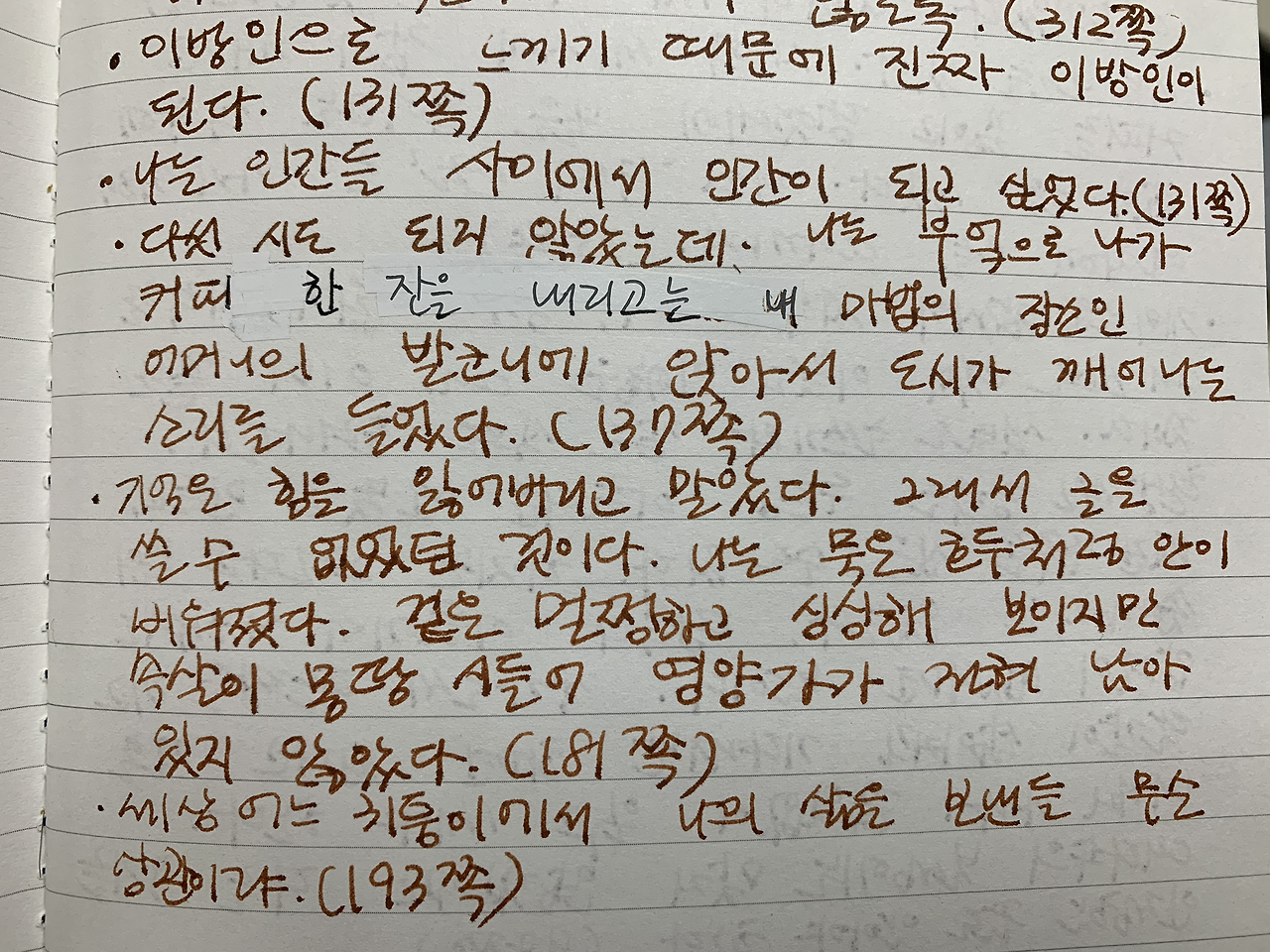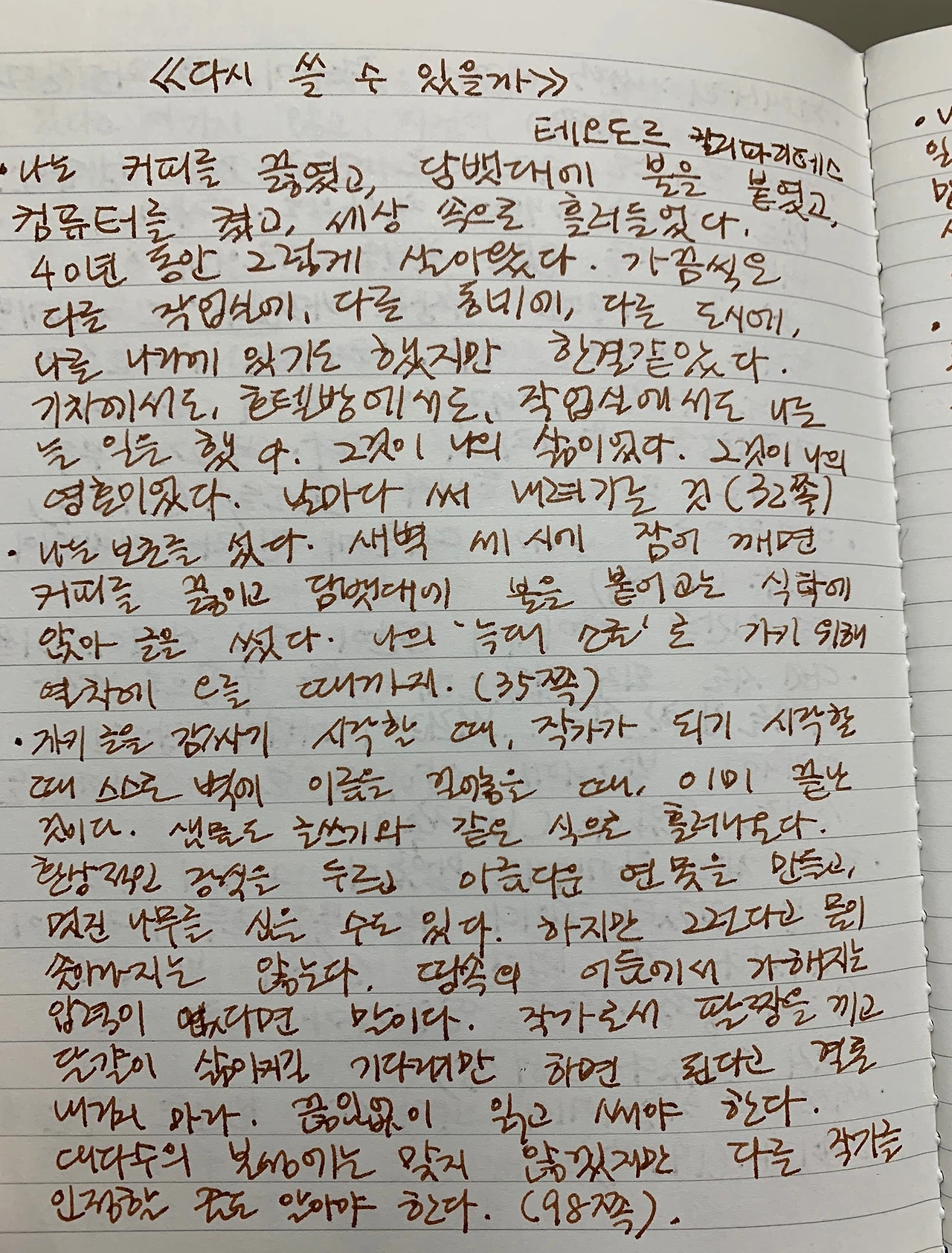 유럽은 자동차로 국경을 넘을 수 있어 다양한 언어를 접하는 게 우리나라보다 쉬울 것 같다. 그리스를 여행하는 다복한 노부부의 이야기를 읽으며 그런 생각을 했다. 책에는 낯선 내용이나 개념도 많이 등장한다. 그래서 얇은 책인데도 이해하기가 쉽지 않았다. 이상하게도 글쓰기에 대한 부분은 보석처럼 나에게 쏙쏙 와서 박혔다. 나의 관심이 볼록렌즈가 되어 태양 빛으로 종이를 태우듯 글쓰기에만 열정이 타올랐다. 이 글을 50년 만에 모국어로 쓰다니. 나이가 들면서 고향을 찾고, 고국을 그리워하는 마음이 담긴 것 같다. 책을 읽으며 글은 저절로 써지는 것이 아니라 엄청난 노력과 집중의 결과라는 생각을 했다.