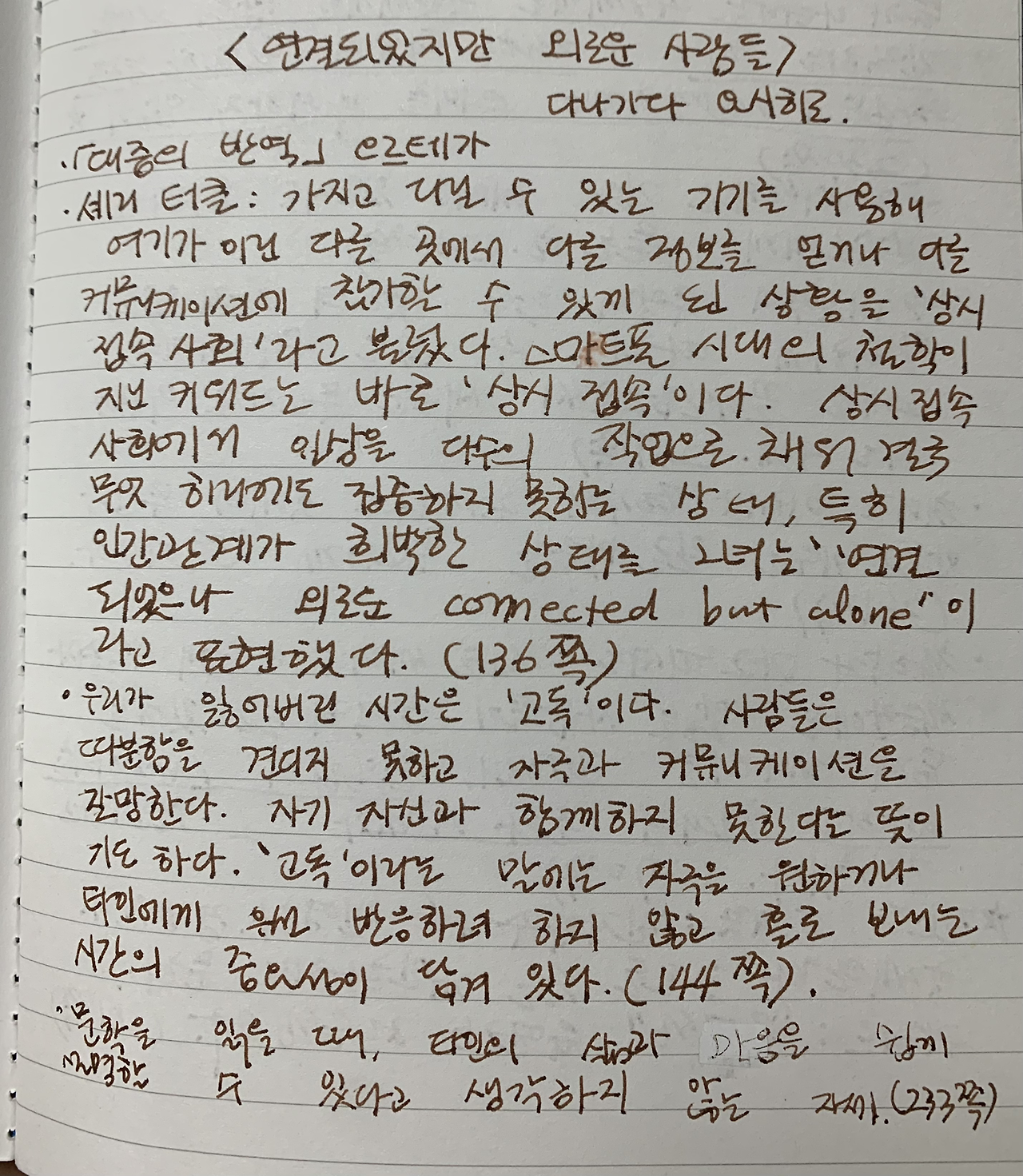 신자유주의를 표방하는 포스트 포디즘 시대인 요즘은 모든 것이 개인화되었다. 지나친 개인주의는 사람을 더 외롭게 만드는 것 같다. 개인적인 자유를 존중하되 동료애의 소중함을 잊어서는 안 되겠다. 우리는 홀로 살아갈 수 없는 존재이다. 고독이 아무리 사람을 성장시킨다고 하고, 요즘은 혼자라도 괜찮다는 힐링 도서도 많지만 그럴수록 다른 이를 돕고, 무언가를 나눔으로 동료애를 느낀다면 오히려 행복하게 살 수 있을 것 같다.