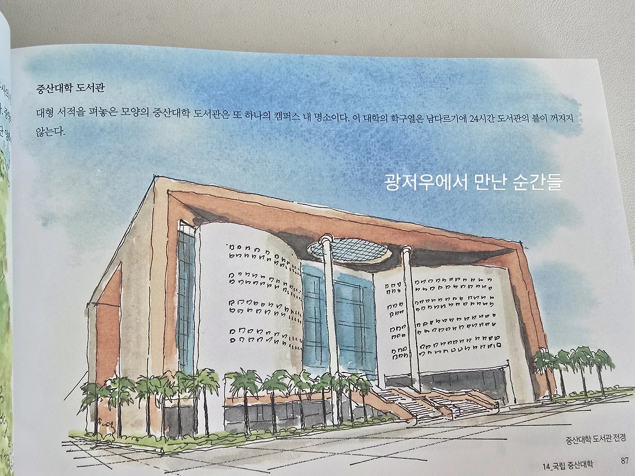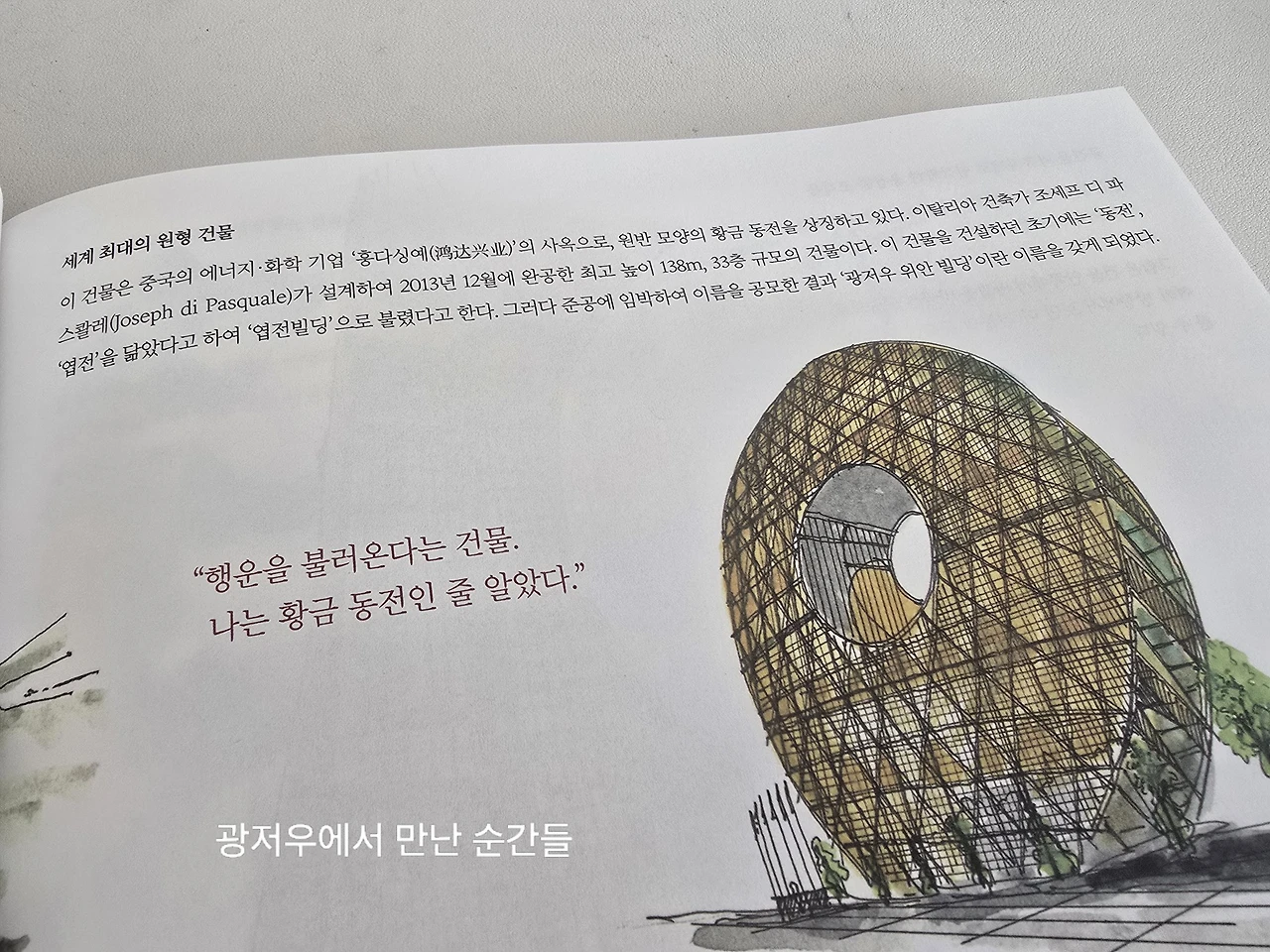 중국 여행이라면 아이들이 아주 어렸을 때 상하이에 다녀온 게 전부여서 별 생각이 없다. 책을 읽다 보니 동남아를 방불케 하는 무더운 날씨와 열대 과일(두리안)이 열린다는 광저우에는 한번 가볼 만하겠다는 생각이 든다. 건축공학가의 눈이라 독특한 건물들의 외양을 그림으로 멋지게 담아두었다. 읽으면서 건축을 전공한 아들에게 읽어보라고 주고 싶다는 생각을 내내 했다.