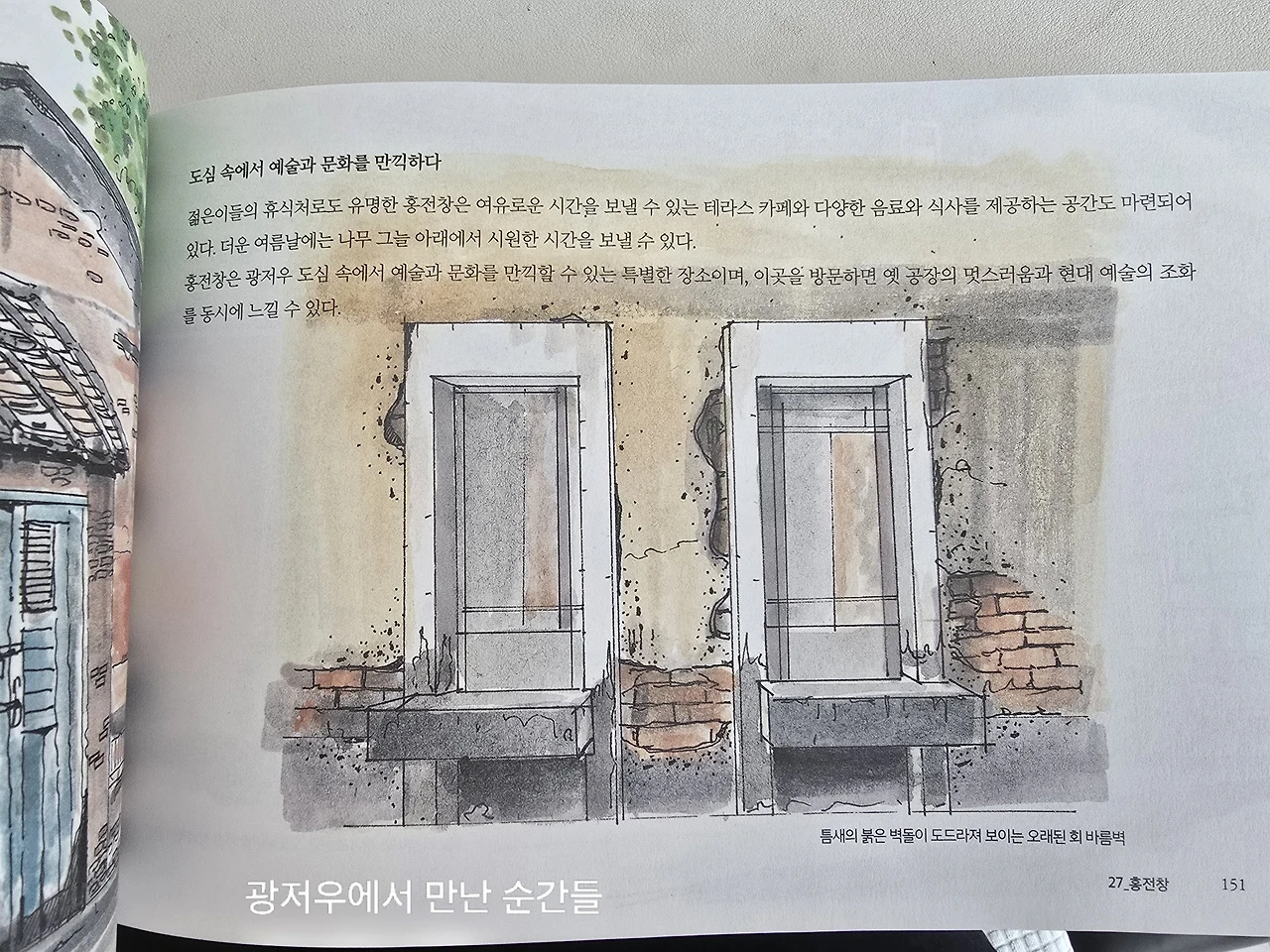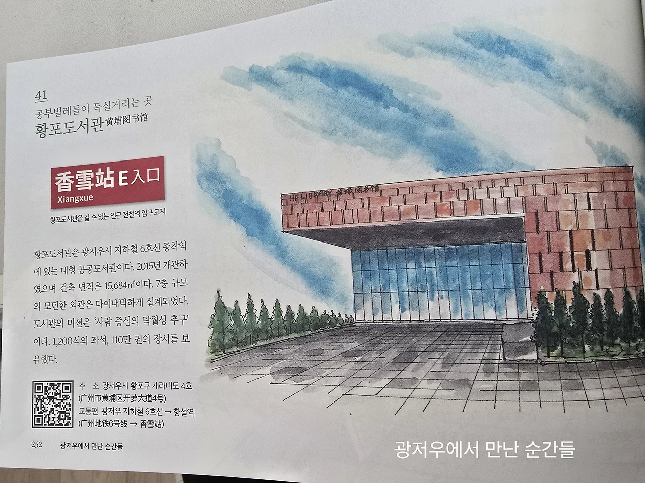 건축공학을 전공했지만 그림에도 관심이 많았던 그는 광저우의 거리거리를 화폭에 담았다. 어반스케치 느낌의 수채화들은 건축가의 스케치와 닮아있다. 수채화의 색상은 단순한 편이다. 파랑, 초록, 빨강, 노랑, 회색의 원색을 중심으로 채색이 되어 있다. 아마도 들고 다니기 좋은 고체물감을 사용하지 않았나 짐작해 본다. 그림에 대한 이야기도 있었으면 좋았겠다 싶은데 책에는 광저우를 대표하는 장소들에 대한 소개가 대부분이다.