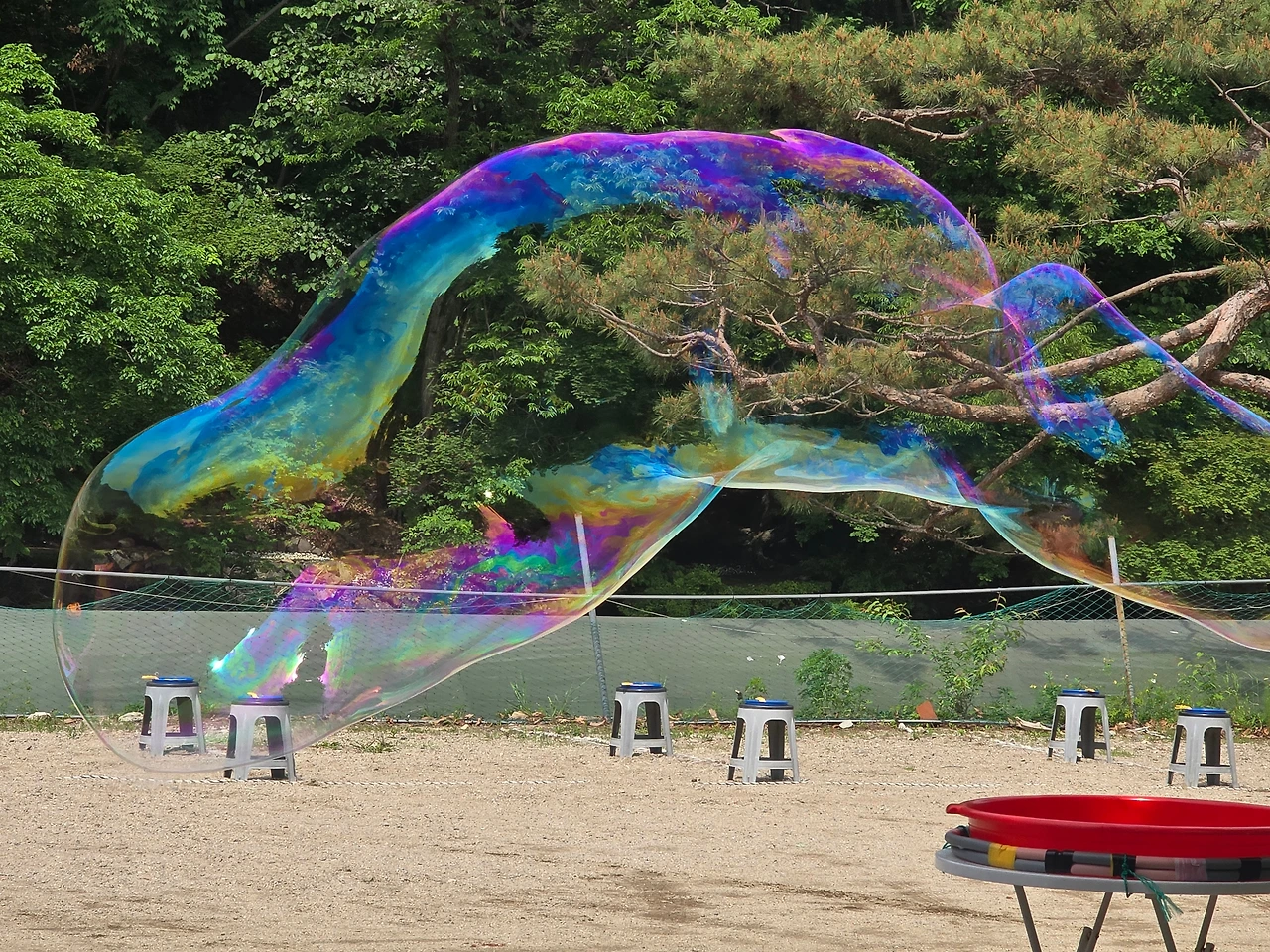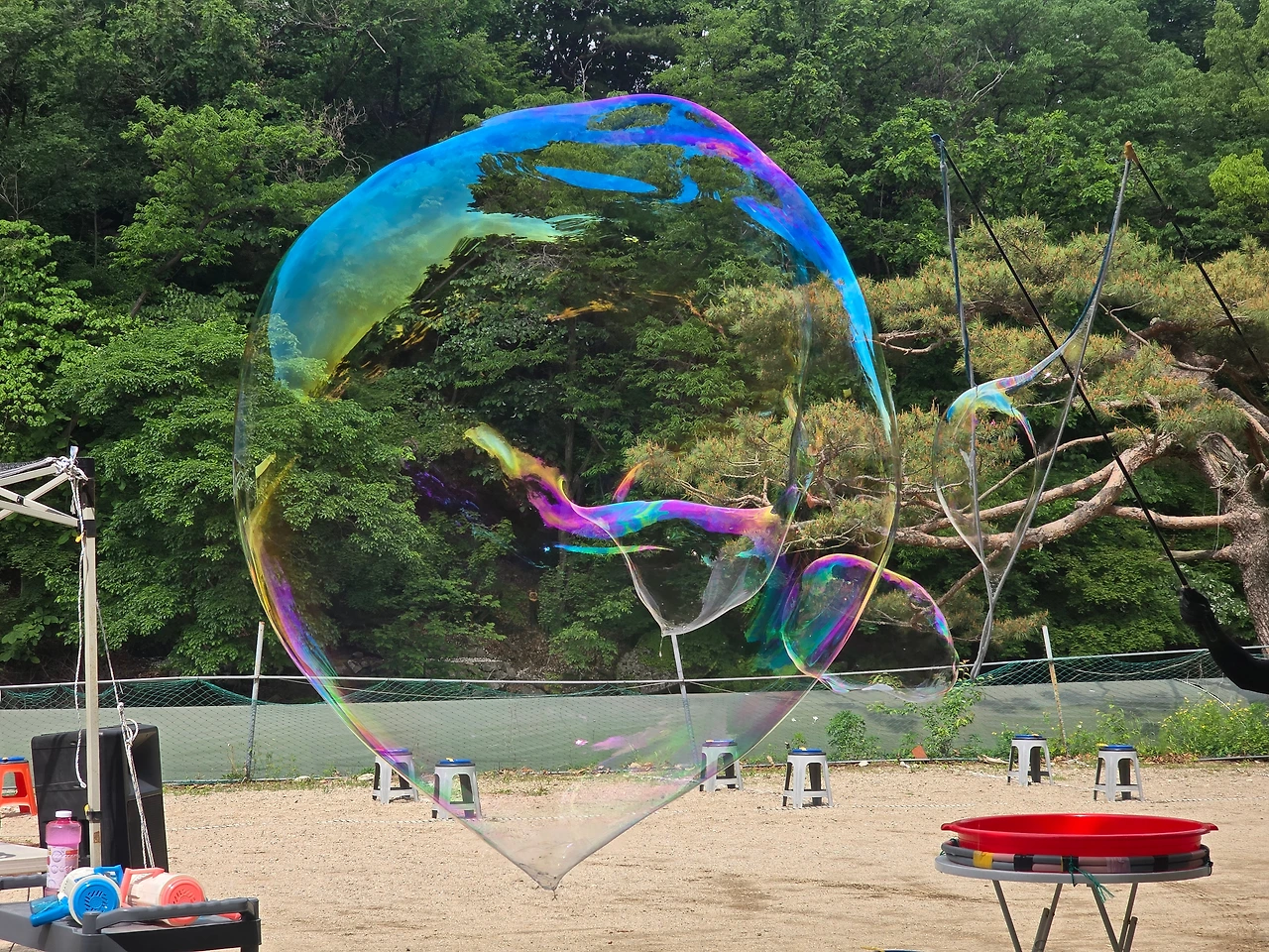 배정된 반에 손길이 필요한 아이가 있어 손을 잡고 계속 같이 다녔다. 비눗방울을 좋아하면서도 무서워하는 사랑스러운 아이였다. 반별로 맞춰 입은 색깔 티로 어느 반인지 바로 알 수 있어 좋았다. 학교 건물을 벗어나 계곡을 낀 숲 속에서 활동하니 상쾌하기도 했다. 오전에 비눗방울 체험과 민속놀이를 하고 점심을 먹은 후 도자기에 그림을 그렸다. 오전에 야외활동을 해서 다행이었다. 오후 햇살이 너무 뜨거웠다.